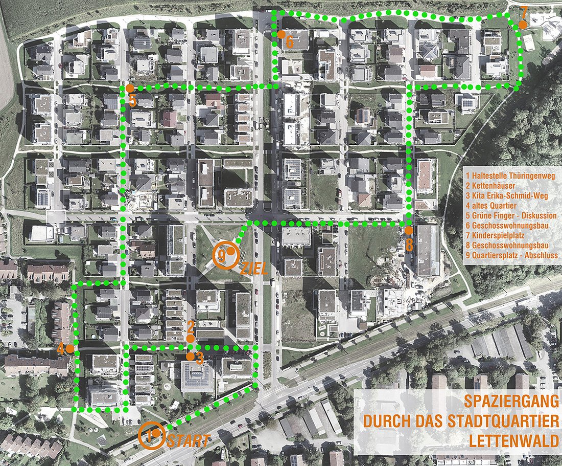 Stadtplaner, Architekten und Landschaftsarchitekten erläuterten an den jeweiligen Standorten ihre Ideen. Aufgrund der Corona-Situation wurden die Gebäude nur von außen betrachtet. Geendet hat der Spaziergang auf dem Quartiersplatz des Lettenwalds mit einem letzten Vortrag und einem gemütlichen Ausklang mit Getränken.