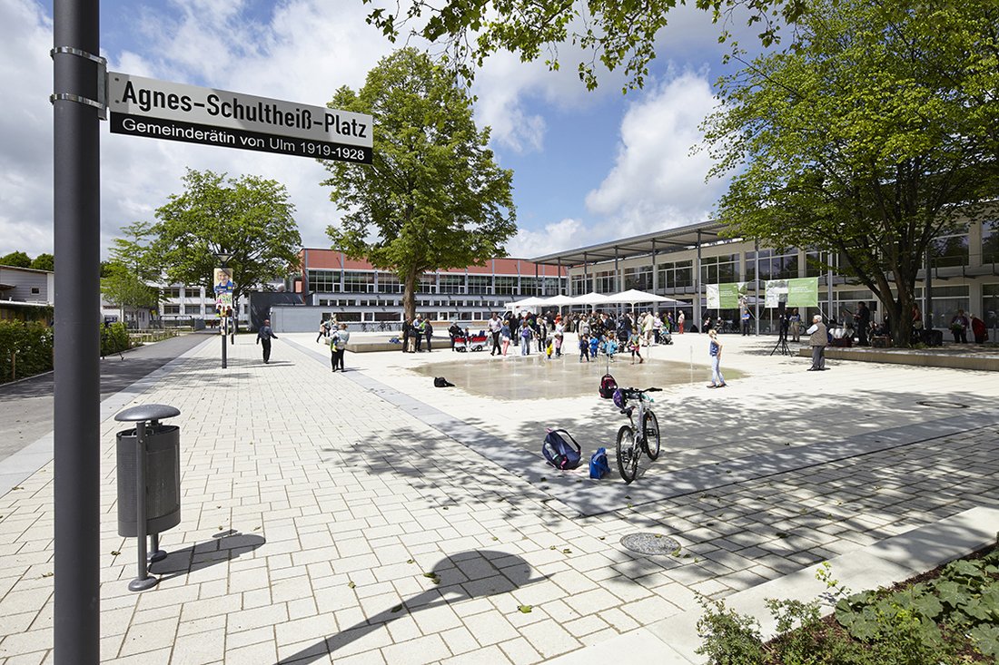 Wohn- und Geschäftshaus Moltkestraße 20 mit Agnes-Schultheiß-Platz | 2018 Moltkestraße 20, Ulm Wohnungen für Geflüchtete und Büros für Sozialverwaltung der Stadt Ulm der Ulmer Wohnungs- und Siedlungs-Gesellschaft mbH B Gebäude: UWS - Ulmer Wohnungs- und Siedlungs-Gesellschaft mbH A Gebäude: Freie Architekten Obermeier+Traub, Ulm A Freiräume: faktorgrün Landschaftsarchitekten bdla Beratende Ingenieure Partnerschaftsgesellschaft mbB, Freiburg B Freiräume: Sanierungstreuhand Ulm GmbH