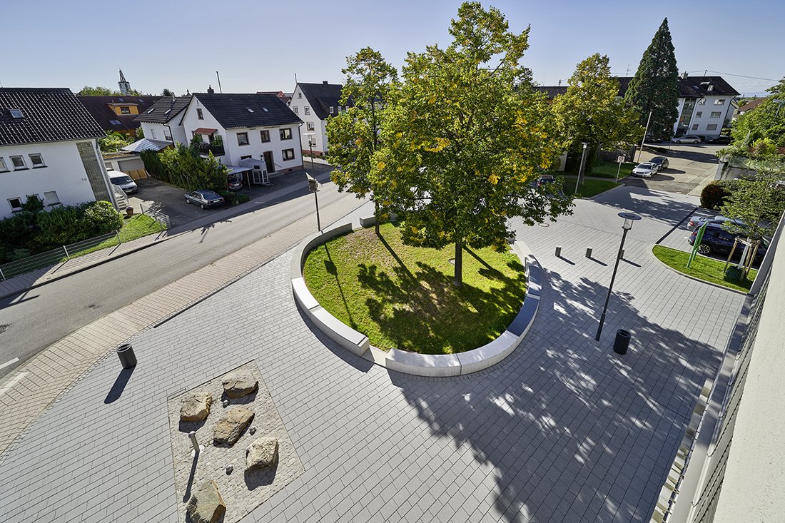 Raiffeisenplatz und Außenanlage Raiffeisenbank (2018)Denzlingen, Raiffeisenplatz 3-5B: Gemeinde DenzlingenLA: Henne Korn Landschaftsarchitekten, Freiburg