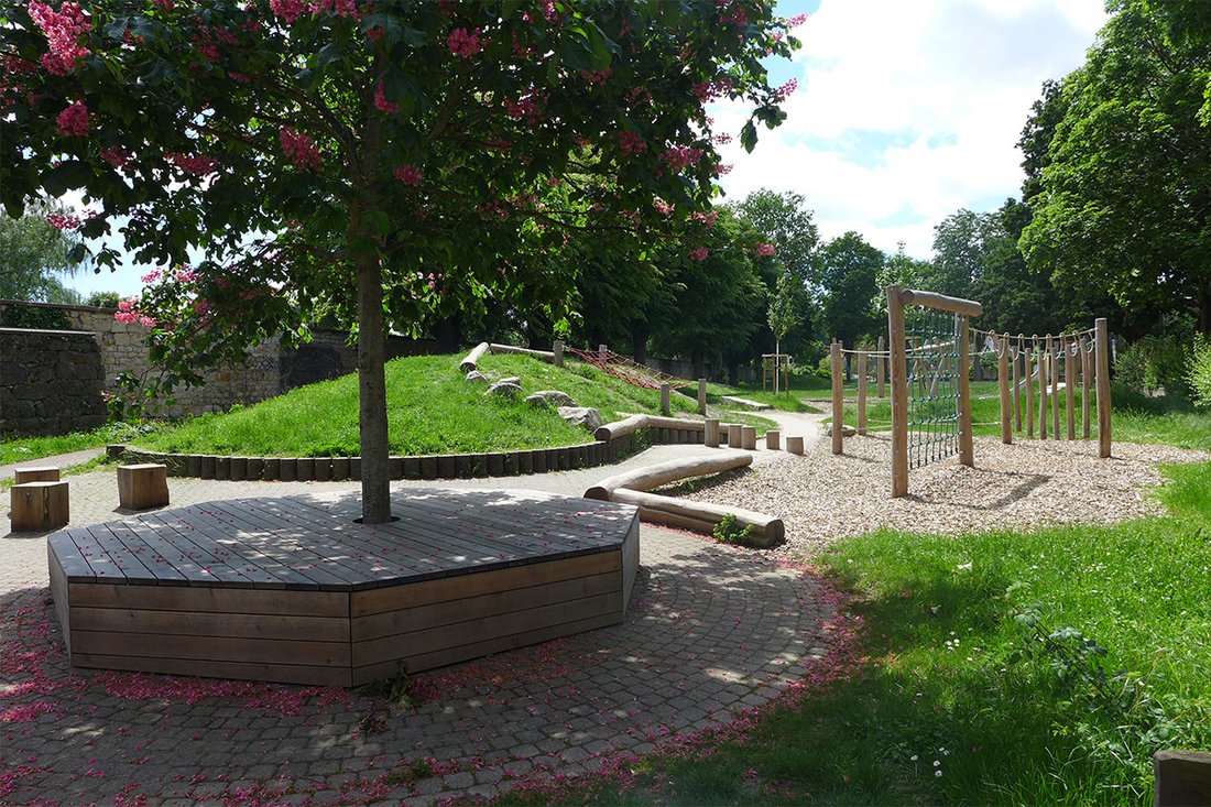 Der Spielplatz ist in verschiedene Bereiche unterteilt, die jeweils durch Sitzbereiche oder Bodenmodellierung voneinander getrennt sind. Der vorhandene gepflasterte Platz am Baum wurde durch ein Sitzpodest und Sitzkuben ergänzt und als Aufenthaltsfläche hergerichtet. Daran angrenzend befindet sich ein Kletter-Balancier-Parcours für Kinder bis ca. 12 Jahre, der sich über den mittigen Hügel zieht. Hier können die Kinder ihre motorischen Fähigkeiten zusammen mit Geschicklichkeit, Gleichgewicht und spielerischer Kreativität verbessern. Es sind einzelne Kletter-Bereiche aufgrund der zu bekletternden Höhe mit Holzhackschnitzelbelag ausgestattet.