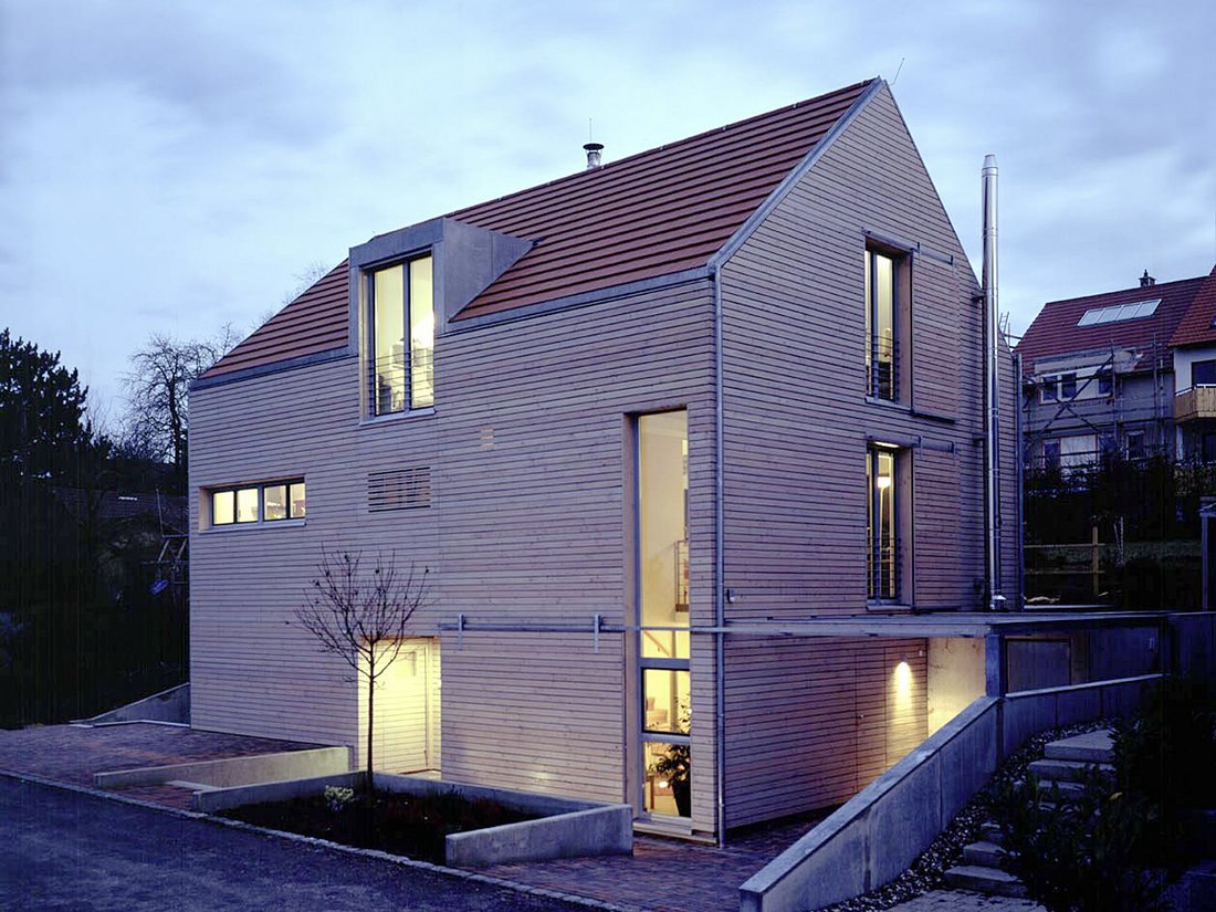 Niedrigenergie-Einfamilienhaus in Holzbauweise (2000)Rupert-Mayer-Straße 32/1, NeuhausenB: Dieter MerlingA: Viktor Koczor, Neuhausen