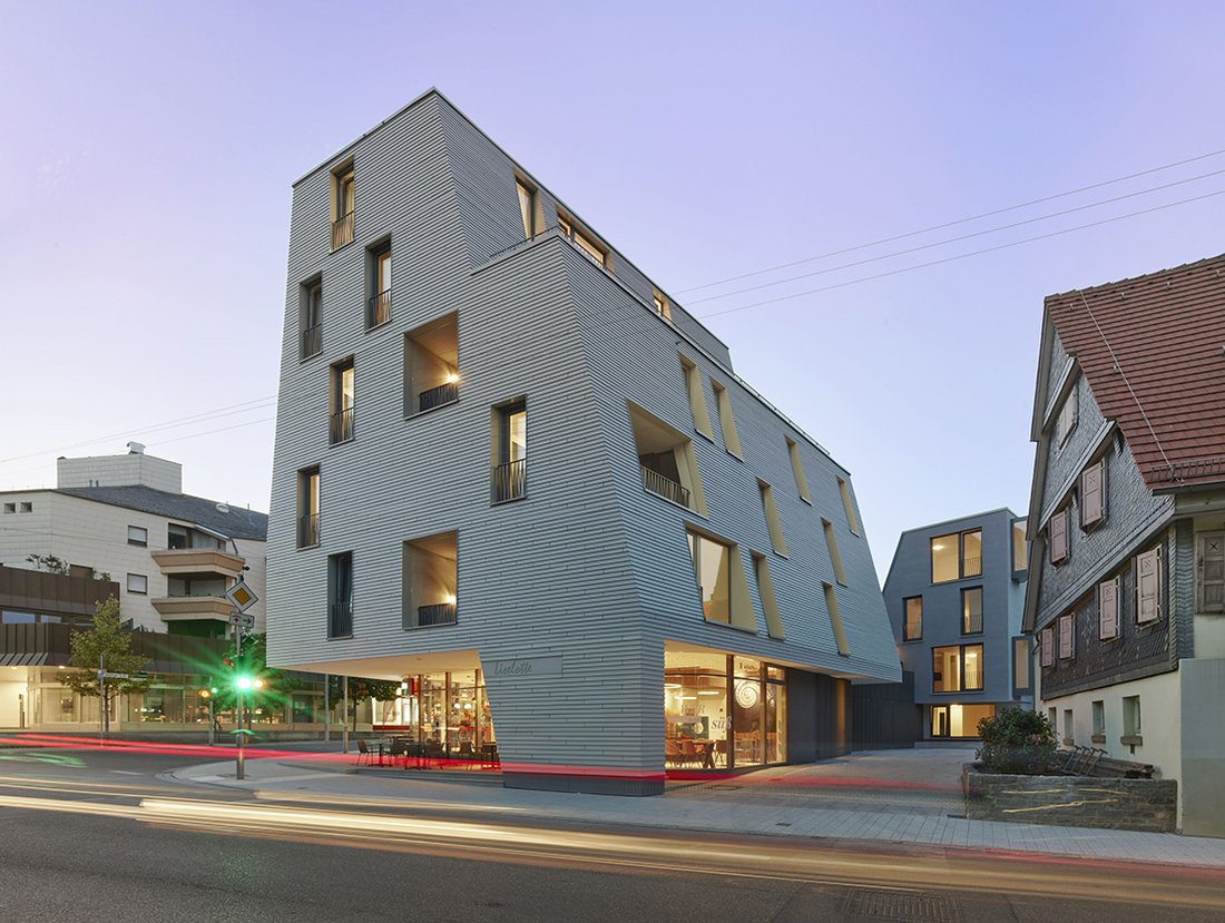 Wohn- und Bürogebäude, Büroma-apart suites (2017)B: Wohnbau Metzger GmbH + Co. KGA: Kaestle Ocker Roeder Architekten BDA (Wettbewerb und Vorentwurf) | kaestle&ocker GmbH & Co. KG, Architekten BDA, Stuttgart (Entwurf und Planung) | Ausschreibung/Bauleitung: Guggenberger + Ott Architekten GmbH, Leinfelden-Echterdingen| Innenarchitektur Bürobereich: Ippolito Fleitz Group GmbH, Stuttgart