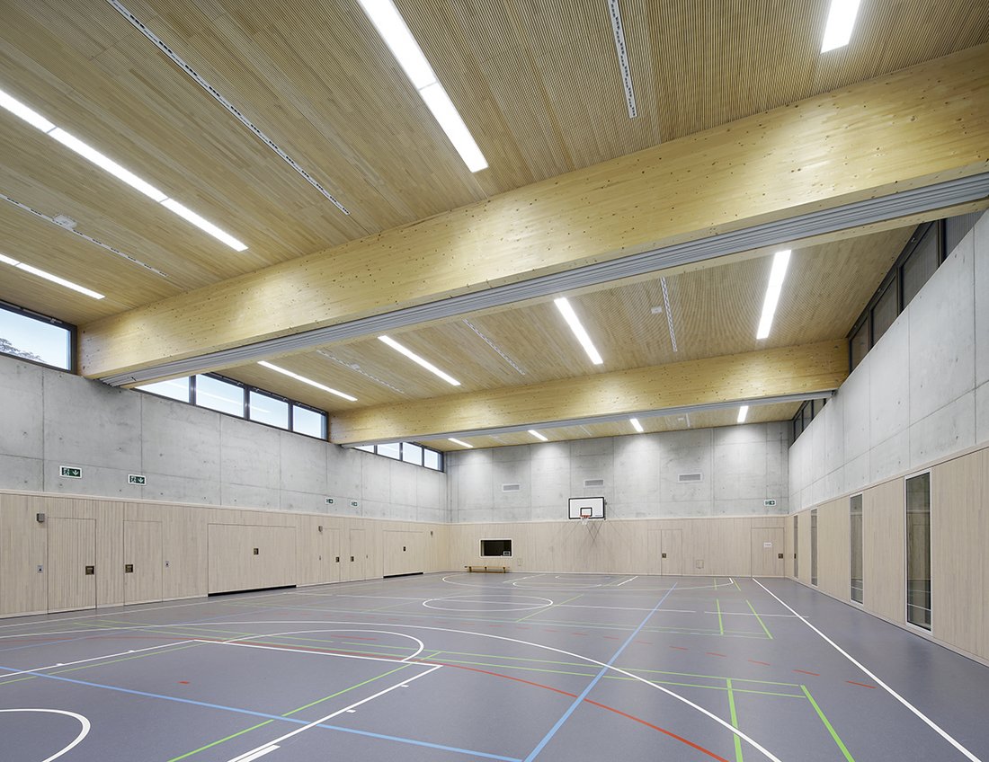 Halle und Vereinsheim orientieren sich zum angrenzenden Wald, der Supermarkt zum Wohngebiet bzw. zum Rheinauer Ring. Der Haupteingang des Vereinszentrums ist durch einen eingeschossigen Einschnitt in der Kubatur artikuliert und befindet sich auf der Westseite. Im südlichen Gebäudeteil sind die Nebenräume (Geschäftszimmer, Küche und Sanitärräume) untergebracht (Grundriss ansehen). Der Gastraum öffnet sich mit einer Eckverglasung nach Osten zum Kiefernwald und nach Süden zum gegenüberliegenden Kindergarten. Herzstück des Gebäudes ist die Sporthalle, die dem Verein Raum für Fußball, Tischtennis, Gymnastik und Tanz bietet. Das Tragwerk der Halle besteht aus Brettschichtholzbindern und Brettsperrholz-Rippenelementen mit integrierten Akustikholzlamellen. Die Fassade ist mit vorgehängten, vertikalen Holzlamellen bekleidet.