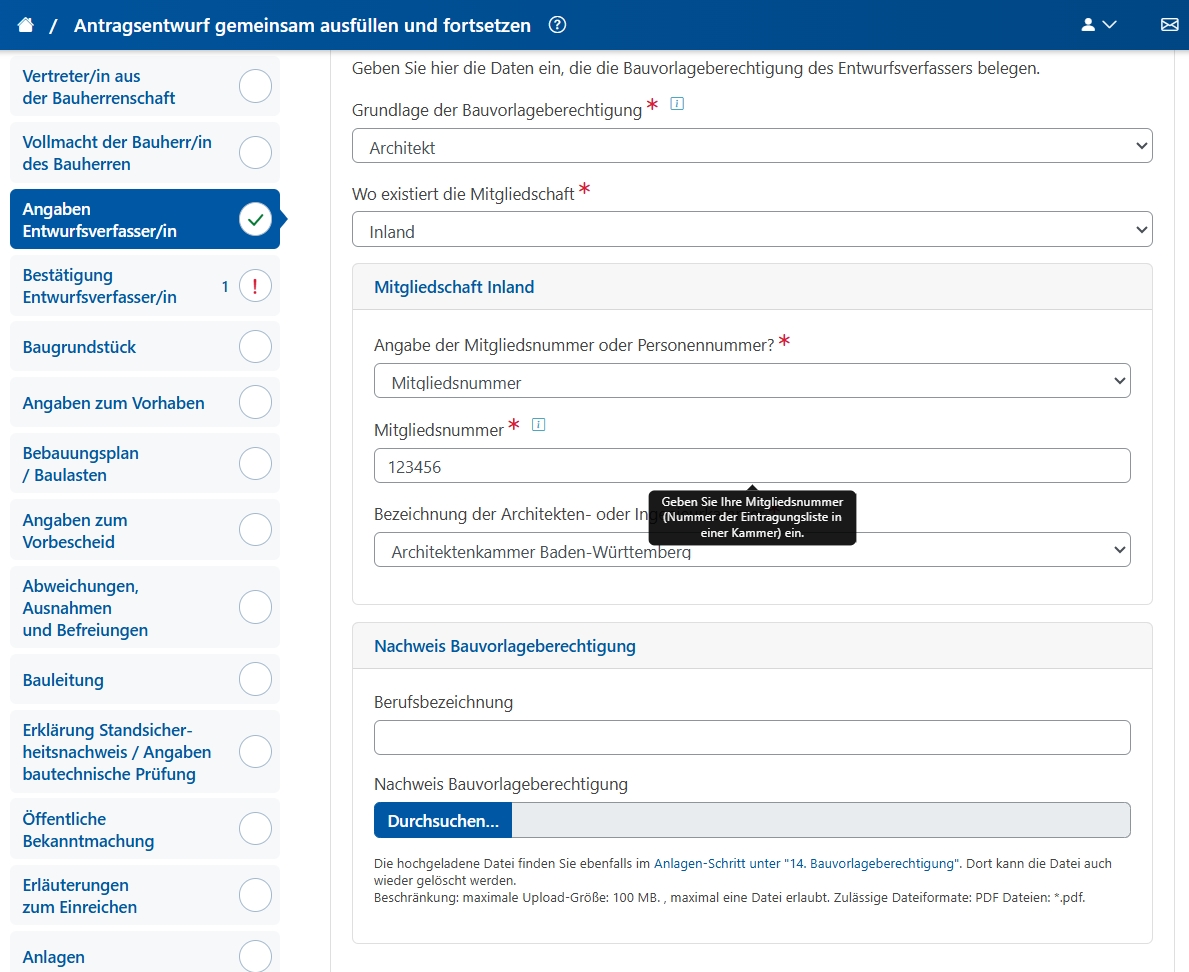Siehe Screenshot eines Beispielantrags mit verifizierten Angaben zum Entwurfsverfasser nur über die AKBW-Mitgliedschaft