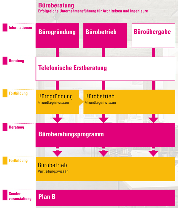 Die Architektenkammer und das Wirtschaftsministerium begleiten und fördern Architekten und Ingenieure bei Neugründungen, Übergaben, Übernahmen und weiteren Beratungsschwerpunkten. Detaillierte Informationen zu den Inhalten und Konditionen des Büroberatungsprogrammes finden Sie hier: