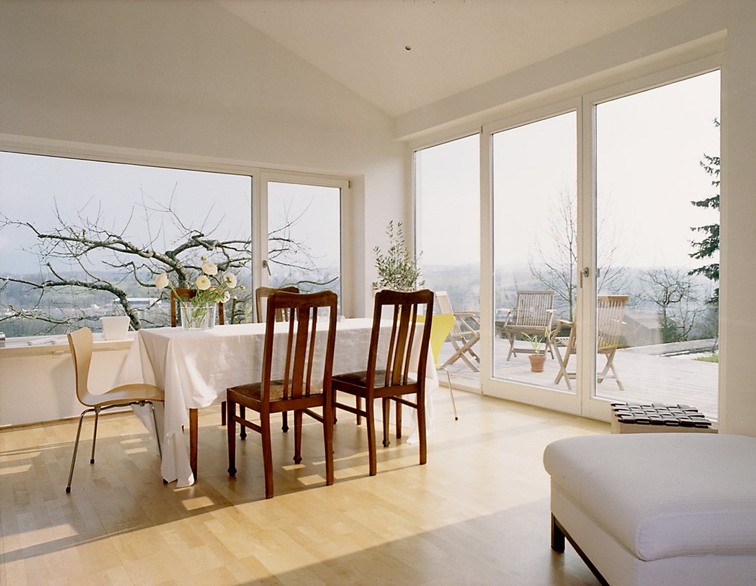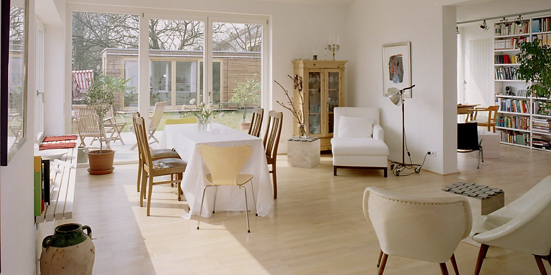 Nach der Modernisierung: Der Wohn- und Essbereich wurde durch das Zusammenlegen einzelner Zimmer und durch das Entfernen der Decke offen gestaltet. Das Öffnen der Wände durch wandhohe Glasflächen und -türen integriert den Garten in das Haus. Insgesamt wurde die Fensterfläche nahezu verdoppelt. Architektin: Gabriele Zinser, bzp Nürtingen.