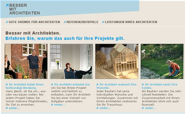Die deutschen Architektenkammern haben eine gemeinsame Homepage mit Informationen für den privaten und gewerblichen Bauherren. Eine bundesweite Architektenliste ist in den Auftritt integriert.