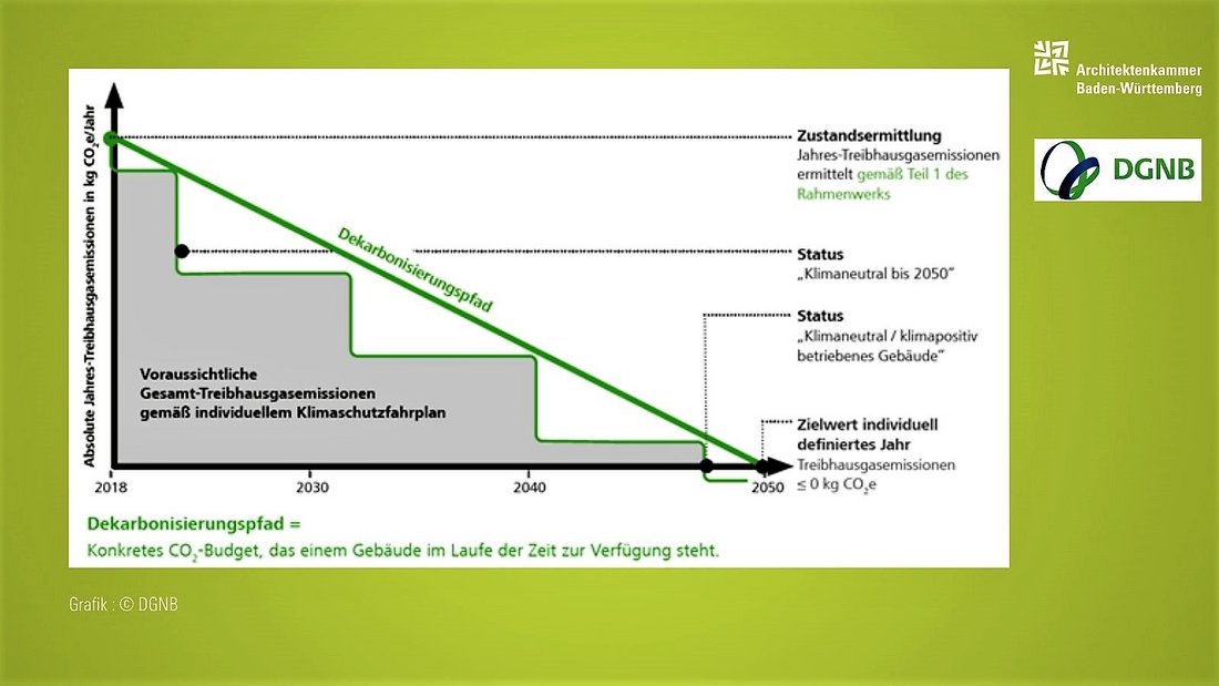 D.h. konkret: In der Jahresbilanz ist ein Wert ≤0 Treibhausgasemissionen für alle Gebäudetypen anzustreben, dabei ist die komplette Energiebilanz die Basis, d.h. Gebäudeenergie (Energie für Transport, Herstellung, Abbau) und Nutzerenergie sind gemeinsam zu betrachten. Ferner verlangt Klimaneutralität die CO2-Vermeidung aus eigener Kraft, d.h. CO2-Zertifikate sind nicht ansetzbar, auf dem Grundstück generierte überschüssige Energie geht aber als Gutschrift ein. Daneben werden alle Energieträger mit den tatsächlich verursachten CO2-Emissionen berücksichtigt.