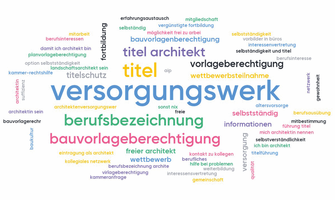 Als Hauptmotive für die Mitgliedschaft nannten sie das Führen der geschützten Berufsbezeichnung sowie die Zugehörigkeit zum Versorgungswerk. Doch zählt für viele auch der Besitz der Bauvorlageberechtigung zu den ausschlaggebenden Argumenten sowie die Möglichkeit an Wettbewerben teilzunehmen und sich dazu von der Kammer beraten zu lassen. Beratungsleistungen nehmen die a+b nach eigener Auskunft auch intensiv bei Rechtsfragen in Anspruch sowie zur HOAI. Insbesondere wenn Kommunen mit externen Architektinnen oder Architekten zusammenarbeiteten, ergebe sich hierfür öfters der Bedarf. Ein Podiumsteilnehmer hob das Angebot des kammereigenen Instituts Fortbildung Bau als besonderen Mehrwert hervor, eine andere Gesprächspartnerin verwies auf den hohen Informationsgehalt des Deutschen Architektenblatts.