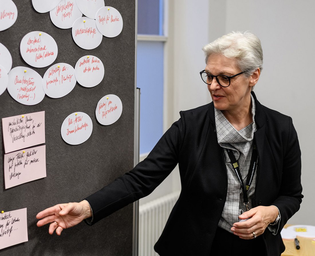 Auf Untergruppen verteilt, besuchten die Teilnehmenden jeweils drei Themeninseln. Unter der Überschrift „Mit Mut agieren – nicht reagieren: Steuerungsanspruch der Kommunen entwickeln“ sammelten sie Vorschläge wie: ein Runder Tisch mit Bürgermeister:innen, Mobilitätskonzepte mit Quartiersparkhäusern und Carsharing sowie eine Bodenpolitik mit Erbbaupacht auf kommunalen Grundstücken. Zu den weiteren Ideen zählten die Sanktionierung von Leerstand und gegebenenfalls sogar ein Bauverbot, um den Leerstand zu aktivieren. Unter dem Titel „Integrative Gestaltungsprozesse fördern“ wurde ein fester Sitz der Architektenkammer in Planungsausschüssen genannt sowie die Aktivierung aller Gesellschaftsgruppen und die frühe Einbindung zukünftiger Bewohner:innen; des Weiteren regten die Teilnehmenden interdisziplinäre Wettbewerbsverfahren an sowie die Intensivierung baukultureller Bildung. Zu den Denkanstößen rund um das Thema „Quartier für Alle als Integrationsversprechen“ gehörte, den Leerstand unkonventionell zu beleben, Quartiers- Treffpunkte einzurichten und Orte/Freiräume zur Aneignung bereitzustellen. Auch Stichworte wie Nachbarschaftshilfe, Jugendarbeit sowie quartierautarke Versorgung über Fernwärme fanden ihren Weg auf die entsprechende Pinnwand