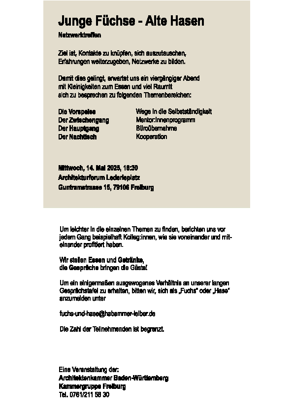 an unsere Veranstaltung im letzten Jahr anknüpfend:„Junge Füchse – Alte Hasen – Wege zum eigenen Architekturbüro“,wollten wir in diesem Jahr mit Ihnen und mit Euch ein neues Format zur Netzwerkbildung ausprobieren: