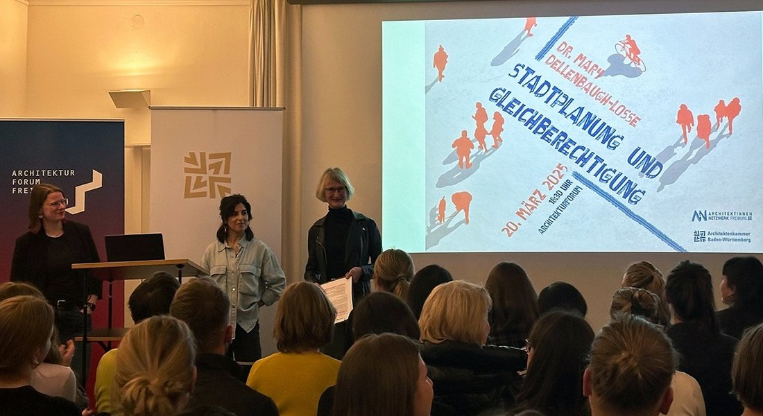 Die Stadtforscherin und Landschaftsarchitektin Dr. Mary Dellenbaugh-Losse vom Berliner Büro „Urban Policy“ kam auf Einladung des Netzwerks der Architektinnen nach Freiburg. Im voll besetzten Architekturforum sprach sie darüber, wie Städte für Frauen besser geplant werden können. In Projekten und Workshops setzt sie sich intensiv mit der Gestaltung sicherer, zugänglicher und einladender öffentlicher Räume auseinander, die die Bedürfnisse aller Menschen berücksichtigen.