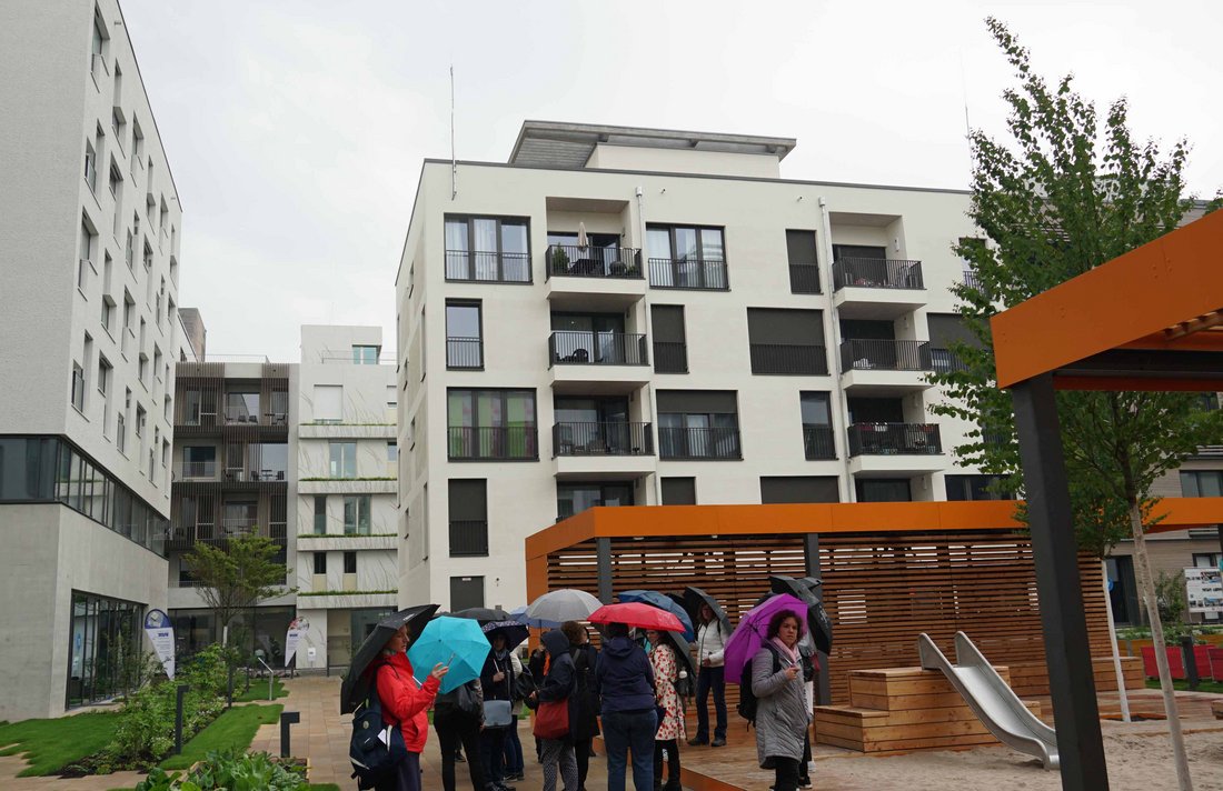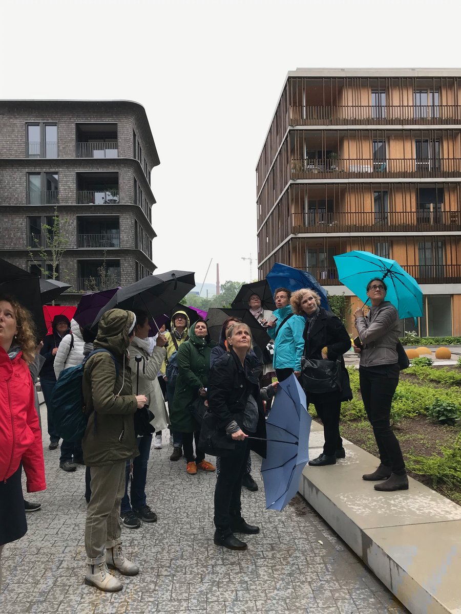 Exkursion zur Bundesgartenschau BuGa Heilbronn 2019 am 20.05.2019AiK _ Netzwerk Architektinnen des Kammerbezirkes Karlsruhevon Simone KraftThinking in the rain … Am 20. Mai machten sich 25 bunte Regenschirme auf um die Bundesgartenschau in Heilbronn in Augenschein zu nehmen. Unter den Schirmen – 25 Architektinnen und Planerinnen aus dem Kammerbezirk Karlsruhe. Die viel besprochene Gartenschau hatte hohe Erwartungen geweckt, insbesondere die Stadtausstellung Neckarbogen, eine städtische Siedlung, die dort erstmals in das Landschaftskonzept integriert wurde. Die Besichtigung führte zwei Stunden durch das Quartier – nicht nur durch das Stadtviertel selbst, sondern auch über die Parkanlage bis hin zum neuen Wall; dort bietet sich ein eindrucksvoller Gesamt- überblick über die Gartenschau samt Stadtausstellung. Fachkundig geführt wurden die Karlsruherinnen von Barbara Brakenhoff – Architektin und Projektleiterin der Stadtausstellung. Ein Volltreffer in jeder Hinsicht: Die Führung geriet ebenso kurzweilig wie informativ. Brakenhoffs langjährige Erfahrung – sie ist seit 2015 an Bord der BuGa – erlaubte manche Einblicke hinter die Kulissen der Planungen, gespickt mit nordisch-trockenem Humor und einer ordentlichen Portion Stolz auf das in Heilbronn Gelungene. Die Führung hat beiden Seiten großen Spaß gemacht, die Themenband- breite war enorm, die Rückfragen kritisch und interessiert. Besonders inspirierend – Brakenhoffs kurze, fast schon impulsvortragartige Kommentare aus ihrem persönlichen Erfahrungs- schatz als bundesweit tätige Architektin. Frauen in der Architektur (hier scheint Baden-Württemberg doch einiges aufzuholen zu haben im Vergleich zu anderen Bundesländern)! Der Umgang mit Investoren und Bauherren (Hartnäckigkeit, Selbst- und Qualitätsbewusstsein zahlen sich aus – Flexibilität ebenso)! Mehr Qualität im Städtebau (Der politische Wille zählt ebenso wie Konsequenz und Visionen. Und bewusst durchgesetzte Regeln. Tatsächlich ist kein Investor abgesprungen)! Welche Bedeutung hat der öffentliche Raum in einer Stadt wie Heilbronn, die sich von einer Arbeiterstadt zum Science-Standort entwickeln will, welche Bedeutung will man ihm geben? Und nicht zuletzt auch – was kann eine Gartenschau dabei erreichen? Zur Stärkung ging es danach in die Alte Reederei auf dem Parkgelände mit stylischer Einrichtung, die dabei jedoch weniger auf Aufenthaltsqualität setzt, ehe es wieder hieß: Schirme auf. Der Nieselregen hatte sich keine Pause gegönnt. Mit Monika Göbel von der Universität Stuttgart ging es weiter zu den beiden bionischen Pavillons, zwei hochinnovative Leichtbaukonstruktionen, die jeweils 500 Quadratmeter Fläche überspannen. Ein Pavillon ist gefügt aus großen fünf-, sechs- oder siebeneckigen Holzkassetten und bietet gute akustische Bedingungen für Veranstaltungen. Kohle- und Glasfasern bilden die Tragstruktur des anderen Flächentragwerks. Komplett digital geplant und gefertigt sind die beiden Pavillons weltweit einzigartig. Als wissenschaftliche Mitarbeiterin am Institute for Computational Design and Construction der Universität Stuttgart bei Achim Menges war Göbel für die Entwicklung und Realisierung beider Tragwerke als Projektleiterin verantwortlich. Eine kompetentere Führung zu den experimentelleren Bauten hätte man sich kaum wünschen können – die Arbeit mit biologischen Strukturen und die Art der robotischen Fertigung faszinierte und verblüffte. Auch wenn der hartnäckige Mairegen das Schlendern durch den Park nach Ende der offiziellen Teile dann doch verkürzte, das Fazit der Karlsruher Architektinnen fiel einhellig aus: Die BuGa lohnt sich, wir kommen wieder!Organisiert vom AiK _ Netzwerk Architektinnen Kammerbezirk KarlsruheLisa Oppold, Susanne Böhm und Barbara FriedrichLink auf der Websitehttps://www.akbw.de/wir-ueber-uns/kammerbezirk-karlsruhe/aik-architektinnen-im-netzwerk-exkursionen.html