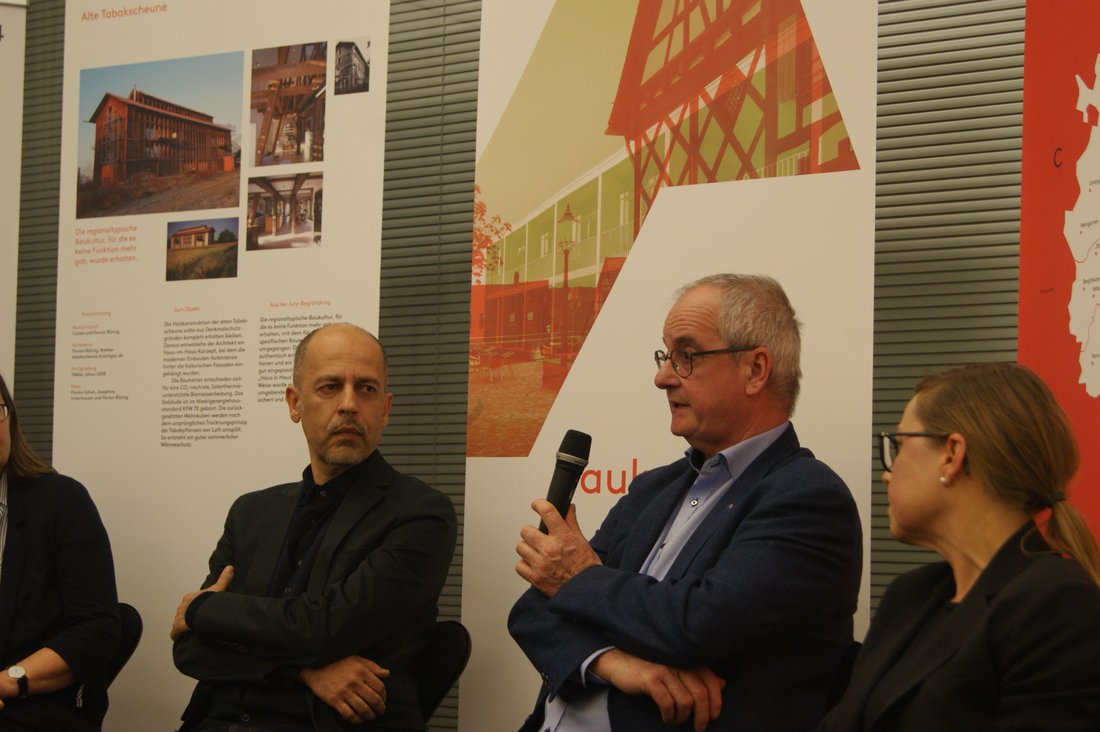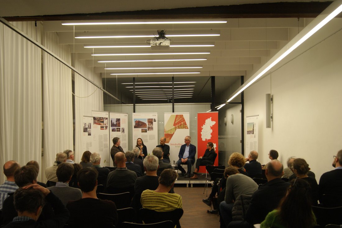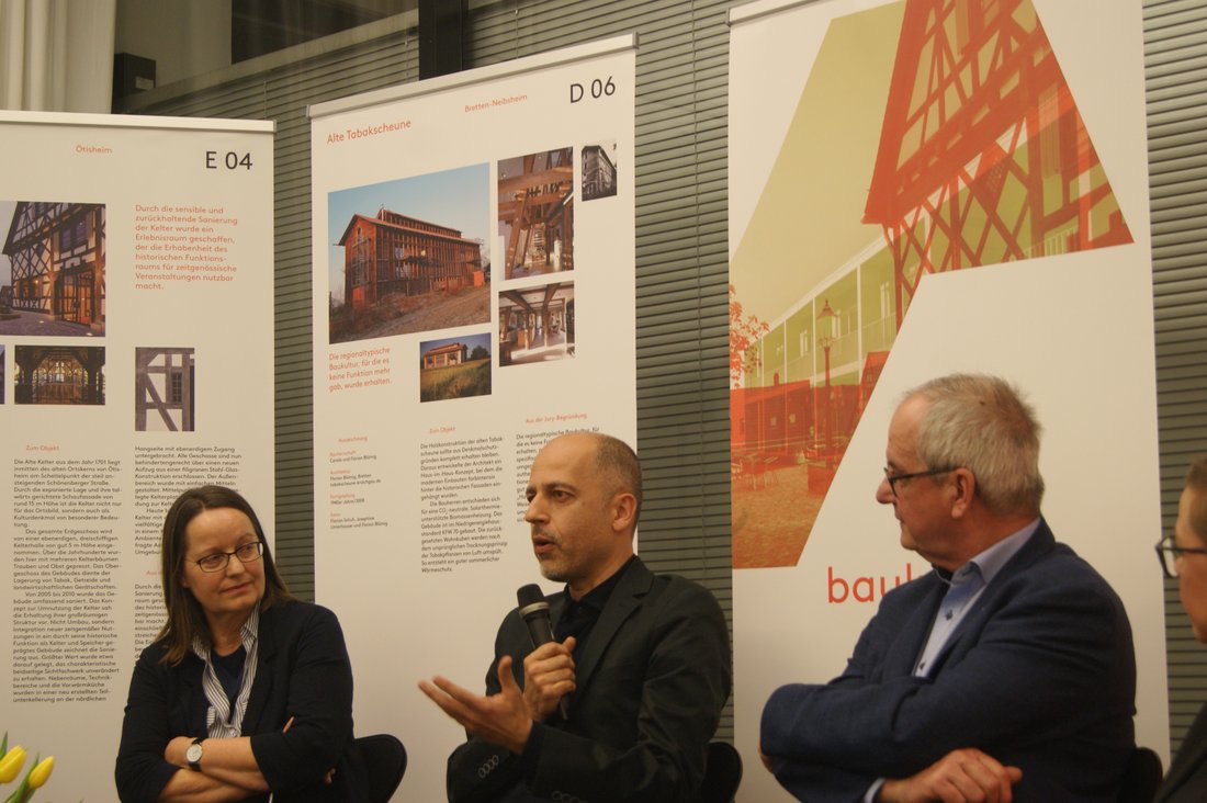 Podiumsdiskussion zum Abschluss der Wanderausstellung „Baukultur Kraichgau“von Susanne Böhm, Kammerbezirk KarlsruheKnapp 40 Interessierte begrüßte Andreas Grube, Vorsitzender des Kammerbezirks Karlsruhe, am 10. März 2020 zum Podiumsgespräch rund um Kraichgau, Baukultur und regionalen Tourismus im Rahmen der Ausstellungseröffnung Baukultur Kraichgau im Architekturschaufenster. Gemeinsam mit vier Vertreterinnen und Vertretern aus den Bereichen Tourismus, Wein und Architektur galt es, einen Blick nach vorne zu wagen, Impulse aufzunehmen und Prozesse anzuregen.Der Kraichgau, das Land der 1000 Hügel, sei nie eine homogene Region gewesen, so Christina Lennhof, Geschäftsführerin des Kraichgau-Stromberg Tourismus e.V., sondern habe oft einem großen Schlachtfeld geglichen. Auf kleinstem Raum stehen oft viele kleine Gehöfte – bedingt durch Realteilung, die gleiche Aufteilung unter Erbberechtigten. Wo also ist die Identität dieser Region, die in der Vergangenheit nicht reich war und nun als badischen Toskana gilt?