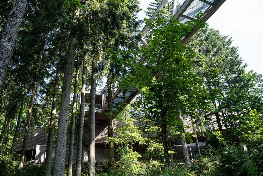 Der größte Baukran des Landes kam mehrmals an seine Leistungsgrenze. Wenn Tannen an die statische Grenze gelangen, können speziell geformte Buchenholzträger weiterhelfen. Bäume im Wald wurden als Nicht-Bäume abstandstechnisch neu definiert , um das Gebäude so nah wie möglich an die Natur zu bringen.