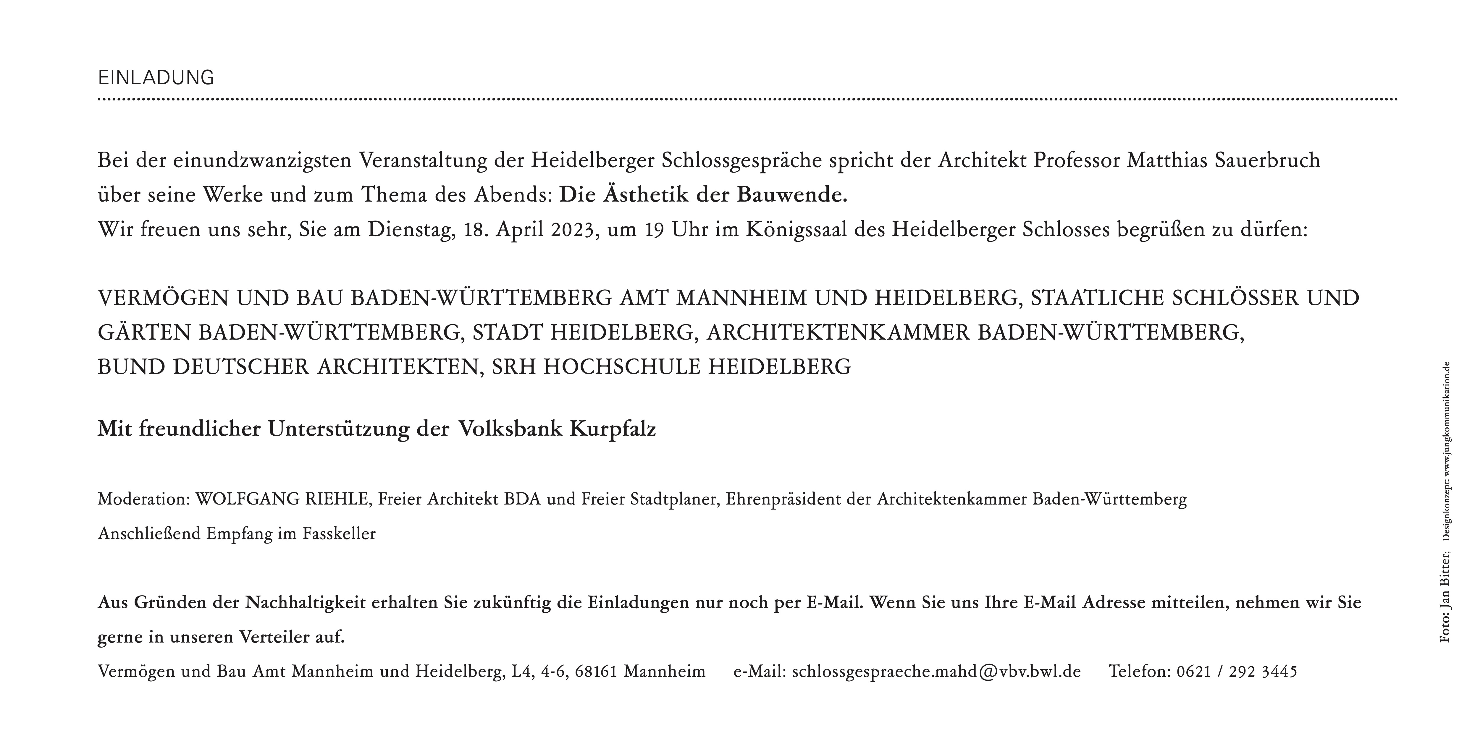Das Veranstaltungsformat hat sich bewährt: Einem Vortrag einer renommierten Architektin oder eines renommierten Architekten folgt eine moderierte Diskussionsrunde. Die inhaltliche Ausrichtung hat sich in den vergangenen Jahren deutlich verändert: weg vom Bereich „Neues Bauen in historischer Umgebung“ hin zu Fragen der Nachhaltigkeit und der Auseinandersetzung mit den brennenden Themen unserer Zeit. Ein unausweichlicher Paradigmenwechsel, so Riehle, der diesmal Matthias Sauerbruch, Partner im Büro Sauerbruch Hutton und Gründungsmitglied der Deutschen Gesellschaft für Nachhaltiges Bauen (DGNB), als Referenten begrüßte.