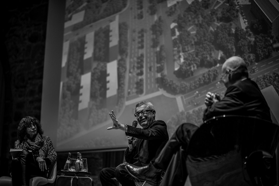 Im anschließenden Podiumsgespräch mit der Ausstellungskuratorin Kristin Feireiss, Kaye Geipel von der Bauwelt und Moderator Reinhard Hübsch konnte Libeskind seine Standpunkte zum Arbeiten im historischen Kontext noch weiter präzisieren. Für ihn sei Tradition nicht der liebe Hund, den man zähmen könne; im Gegenteil, Tradition und Geschichte seien teilweise gewalttätig und Nostalgie als Selbstzweck funktioniere nicht in der Architektur. Auf die Frage, wie man Erinnerungen in Architektur umsetzen könne, meinte Libeskind, man müsse sich auf das Experiment der Erinnerung als physische Erfahrung und als zentrales Element der Architektur einlassen. Sie sei die Verbindung zu einer nonverbalen Sprache – Rezepte zur Umsetzung könne er aber keine geben. Problematisch sei allerdings die Verlagerung der Erinnerungen in eine virtuelle Welt, was dazu führe, dass heutzutage geschichtslose Städte gebaut würden.