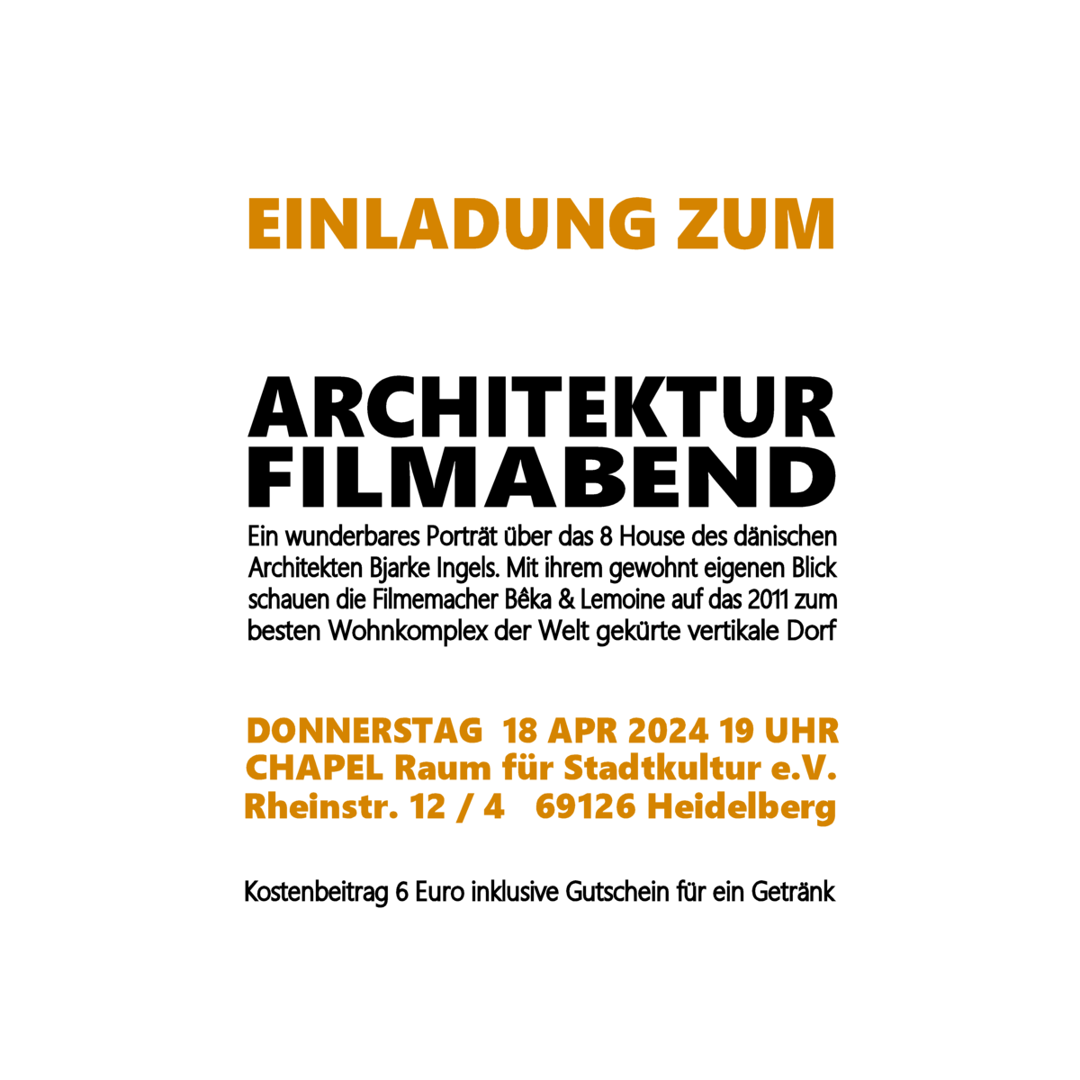 Liebe Mitglieder, formAD e.V. und die Architektenkammer Baden-Württemberg, Kammergruppe Heidelberg, laden alle Architektur- und Designinteressierte zum vierten Architekturfilmabend in der Chapel in Heidelberg ein. In dem Film "The Infinite Happiness" schauen sich die mehrfach preisgekrönten Filmemacher Ila Bêka und Louise Lemoine mit ihrem gewohnt eigenen Blick das "8 House" der dänischen Bjarke Ingels Group an. Das 2009 am Stadtrand von Kopenhagen errichtete "vertikale Dorf" mit insgesamt 476 Wohnungen wurde 2011 zum besten Wohnkomplex der Welt gekürt. In 30 kurzen Episoden teilen die Zuschauer die Erfahrungen der im, vom und mit dem 8 House lebenden Menschen und lernen die Qualität dieses innovativens Bauwerks kennen, das auch als soziales Kraftwerk verstanden werden darf. Eintritt 6 Euro inkl. Getränkegutschein Donnerstag, 18.04.2024 um 19 Uhr Chapel e.V. - Raum für Stadtkultur Rheinstraße 12/4 69126 Heidelberg Mit freundlichen Grüßen Robert Schmidt hsa herbstrieth.schmidt.architekten Partnerschaft mbB nils herbstrieth robert m.k. schmidt freie architekten diplom-ingenieure fh hochbau städtebau feuerbachstraße 5 69126 heidelberg fon 06221-636702 fax 06221-636700 schmidt@hsarchitekten.de www.hsarchitekten.de