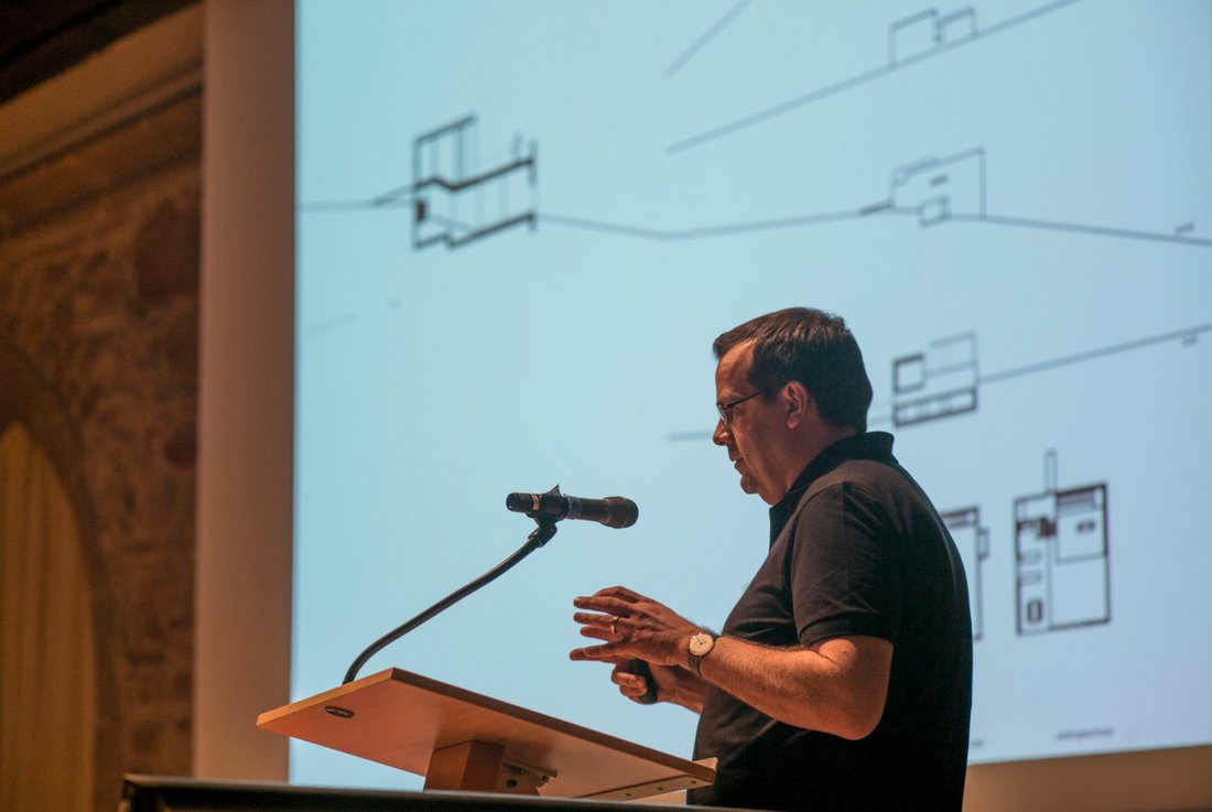 „Heimatarchitektur fern jeder Heimattümelei“ – so bezeichnete Moderator Reinhard Hübsch in der Einleitung zu den 6. Heidelberger Schlossgesprächen die Architektur desVorarlberger Büros Marte und Marte. Und obwohl mit Stefan Marte ein Architekt den Abend bestreiten sollte, der seinen Ruhm hauptsächlich in Insiderkreisen genießt und der breiten Öffentlichkeit kaum bekannt ist, fanden am 10.10.2013 mehr als 500 Besucher ihren Weg in den Königssaal des Heidelberger Schlosses. Diese erwartete eine Begegnung mit einer kompromisslosen und dennoch einfühlsamen Architektur, die sich lohnen sollte.