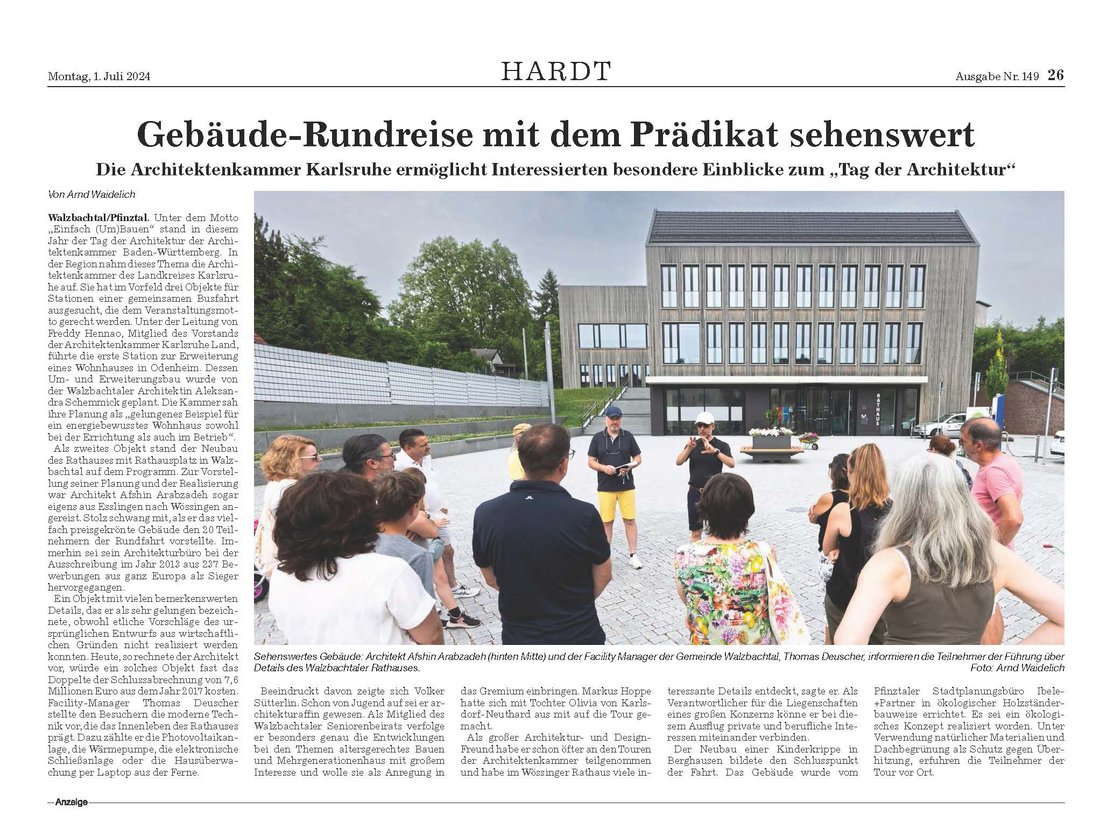 Sehr geehrte Damen und Herren, liebe Kolleginnen und Kollegen, auch dieses Jahr beteiligt sich die Kammergruppe Karlsruhe-Land der Architektenkammer Baden-Württemberg wieder am Tag der Architektur. Das Programm und die Anmeldmöglichkeiten sind auf der Homepage der Kammergruppe einzusehen. Wir hoffen auch dieses Jahr wieder auf eine rege Teilnahme. Aus aktuellem Anlass möchten wir auf eine Veranstaltung der Kammergruppe Neckar-Odenwald-Kreis am 12.06.2024 hinweisen. Die Themen sind sicherlich ohne weiteres auf den Landkreis Karlsruhe übertragbar. Als Titelbild ist zum Beispiel das Rathaus in Walzbachtal-Wössingen von arabzadeh.schneider.wirth freie architekten partnerschaft mbb aus Nürtingen abgebildet, das auch beim Tag der Architektur besichtigt werden kann. Wir freuen uns auf ein Wiedersehen bei einer der anstehenden Veranstaltungen im Laufe des Jahres. Mit freundlichen Grüßen Markus Keller Dipl.-Ing. Architekt Stellvertretender Vorsitzender Kammergruppe Karlsruhe-Landkreis Architektenkammer Baden-Württemberg