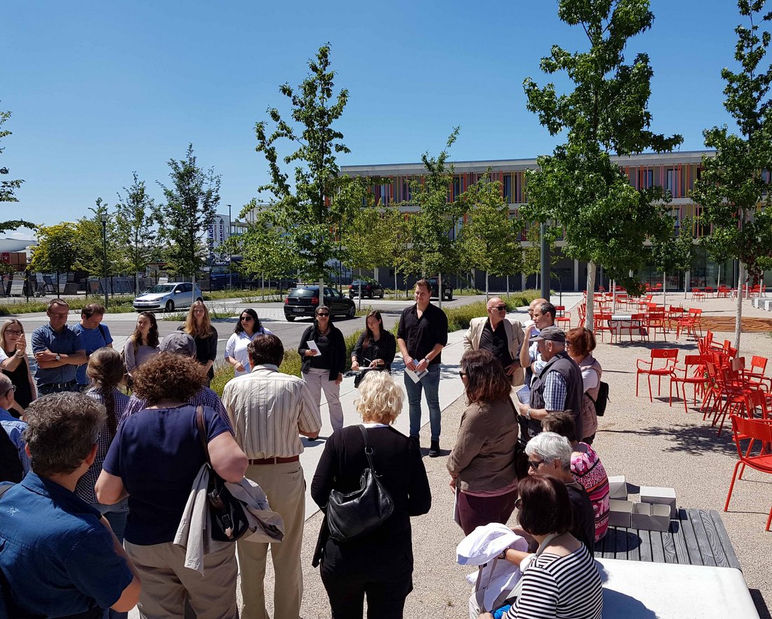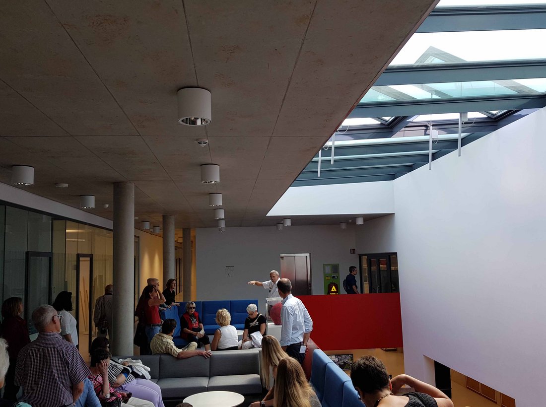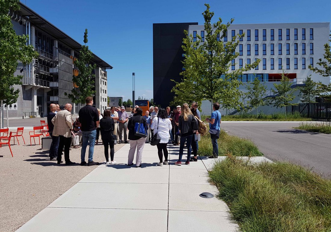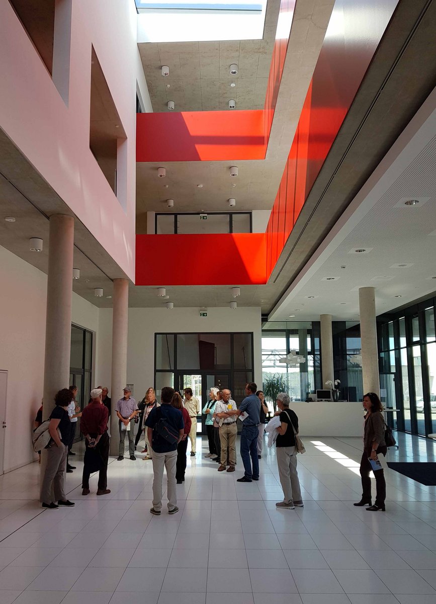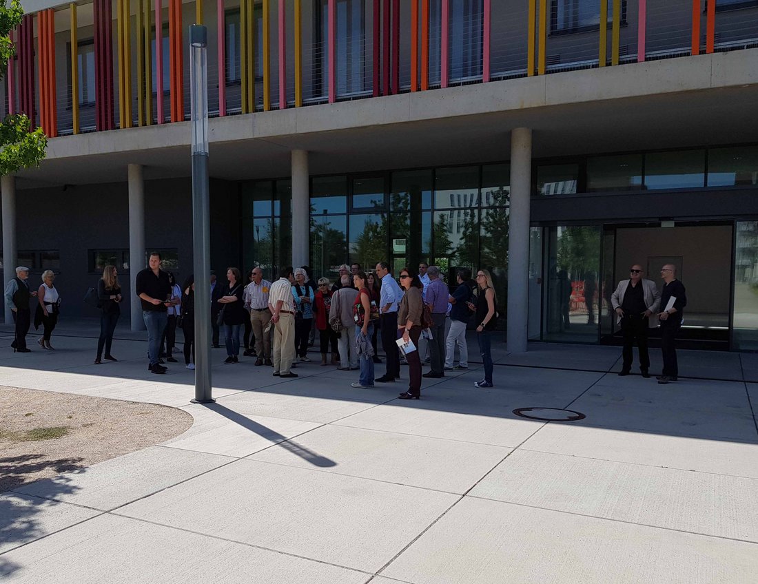 Zum diesjährigen Tag der Architektur unter dem Motto „Architektur bleibt!“ lud die Kammergruppe Karlsruhe-Landkreis im Rahmen einer Busrundfahrt zur Besichtigung von zwei Projekten in Bruchsal ein.Zuerst ging die Fahrt zur neuen Landesfeuerwehrschule Baden-Württemberg. Unter fachkundiger Führung von Etienne Roche, von Vermögen und Bau, Amt Karlsruhe, das als Bauherr und Entwurfsplaner in Erscheinung trat , Herrn Hofmann von bogevischs buero / München, welches mit der Ausführungsplanung beauftragt war, und Herrn Andreas Meyer, Stabstelle Schulleitung, konnten sich die Mitreisenden sowohl von der gestalterischen und funktionalen Qualität, als auch der Aufenthaltsqualität der Unterkünfte und den zur Schulung dienenden Fahrzeughallen bzw. Technikräumen überzeugen. Anschließend stellte Andreas Meyer die Hofgestaltung und das neue Schulungs- und Verwaltungsgebäude vor. Der Vorentwurf stammt ebenfalls von Vermögen und Bau, Amt Karlsruhe. Die Entwurfs- und Ausführungs- planung oblag Gramlich Architekten BDA, Stuttgart. Hier galt es, eine offene, kommunikationsfördernde Atmosphäre zu schaffen. Flure, die das offene Atrium umgeben, dienen diesem Zweck. Die für die Verwaltung notwendigen Räume sind an den Außenwänden angeordnet und haben Fluchtbalkone. So konnten die eben genannten Flure mit ausgewähltem Mobiliar ausgestattet werden und als vollwertige Räume genutzt werden. Bei der zweiten Station der Besichtigungstour erläuterte Architektin Ines Grübel (PIA Architekten Karlsruhe / Mannheim) bei der Führung durch noch nicht bewohnte Stationen das Entwurfskonzept für die Umgestaltung des Evangelischen Altenzentrums. Bauherr war hier der Diakonieverein e.V. Das Bestandsgebäude wurde um zwei Geschosse in Holzbauweise aufgestockt und energetisch auf aktuellen Stand gebracht. Die Terrassen wurden im Zuge dieser Maßnahme begrünt. Im Inneren sind dem wachsenden Bedarf entsprechend Pflegezimmer und Wohnungen für betreutes Wohnen entstanden. Die Geschosse wurden neu zoniert, was durch sorgsam gewählte Farben und Möblierung unterstützt und für die Bewohner positiv erlebbar ist. Der neue Verbindungsbau ermöglicht eine verkürzte Wegeführung zwischen den beiden Gebäudekomplexen und führt so auch strukturell zu einer erheblichen Verbesserung.Moritz Ibele, Vorsitzender der Kammergruppe bedankte sich bei Bauherren und Nutzern für die Öffnung ihrer Räume, bei den Architekten für deren teilweise weite Anreise und die Erläuterungen und bei den Mitreisenden für ihr Interesse an der Architektur. Susanne Hartl / KG Karlsruhe-Landkreis