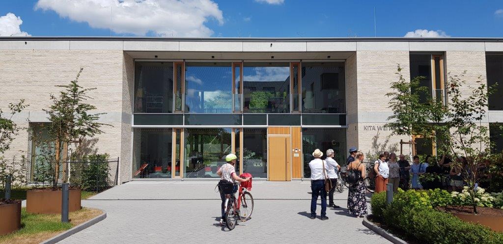 Als nächstes Projekt stand der Neubau der Kita Weitblick auf dem Programm. Geplant von DÍnka Scheible Hoffmann Lehwald Architekten aus Stuttgart wurde hier besonders Wert auf Bezüge zur benachbarten Wohnbebauung und auf freie Blicke in den angrenzenden Park gelegt
