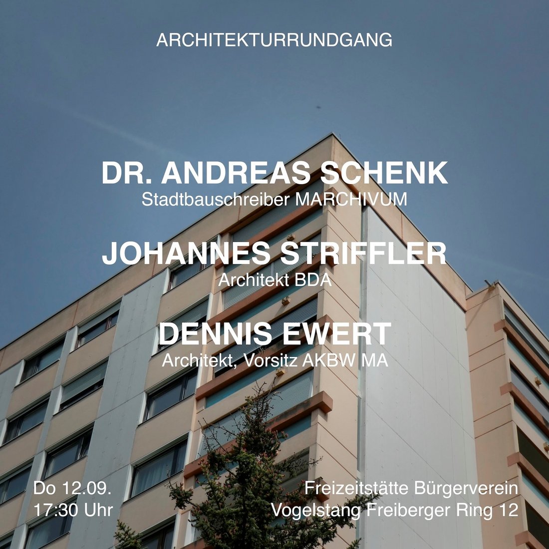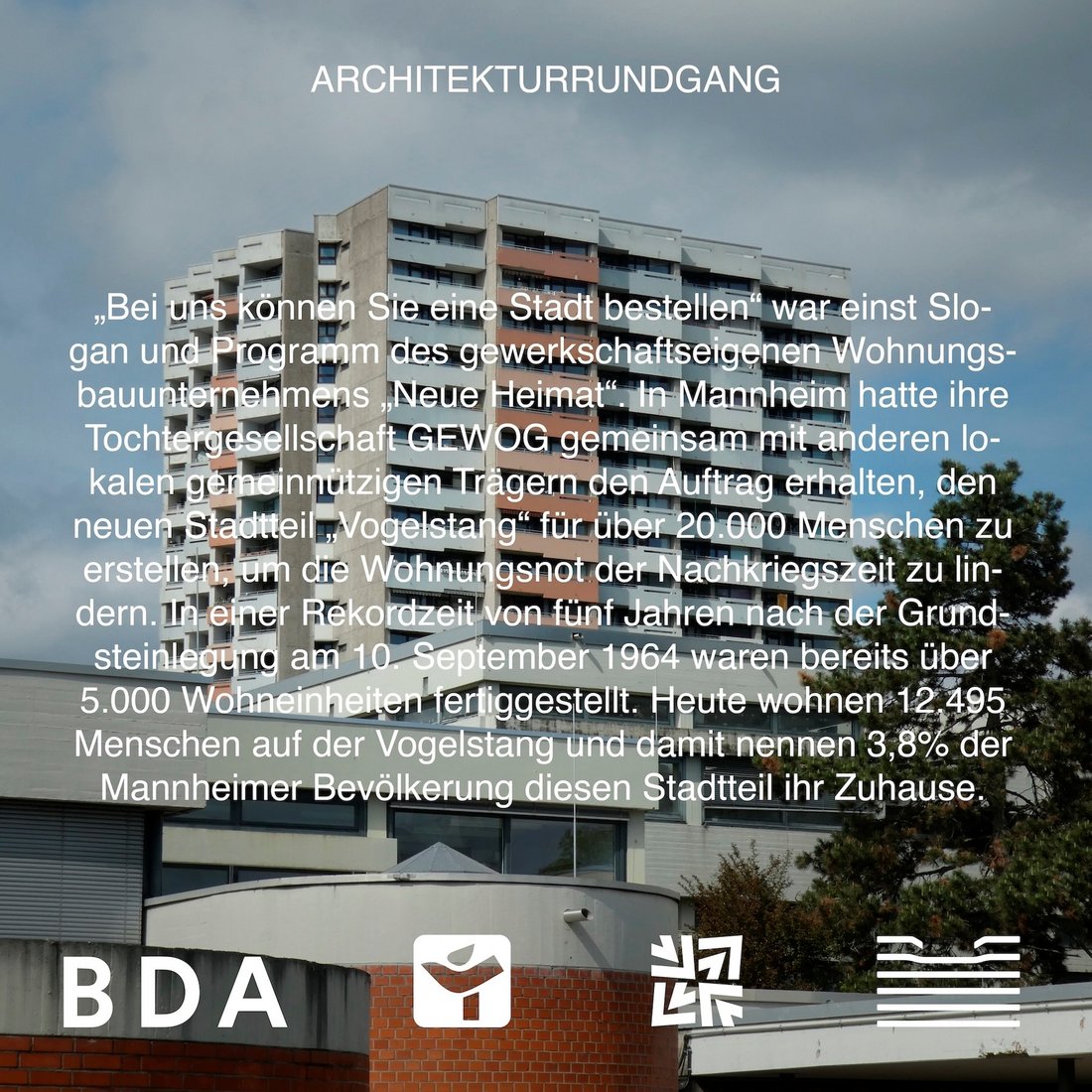 VOGELSTANG UND SEINE BAUTEN Kostenfreier Architekturrundgang, Filmvorführung und Gesprächsrunde mit - Dr. Andreas Schenk (Stadtbauschreiber MARCHIVUM) - Johannes Striffler (Architekt BDA) - Dennis Ewert (Architekt, Vorsitz AKBW MA) Do. 12. September 2024, 17:30 Uhr (Dauer ca. 2,5 Stunden) Treffpunkt: Freizeitstätte Bürgerverein Vogelstang, Freiberger Ring 12 (Vogelstang-Center) Kooperationsveranstaltung MARCHIVUM, Bund deutscher Architektinnen und Architekten Mannheim, Bürgerverein Vogelstang & Kammergruppe Mannheim der Architektenkammer Baden-Württemberg. Eine Anmeldung ist nicht erforderlich. Fortbildungspunkte sind beantragt. Anlässlich der Grundsteinlegung vor 60 Jahren laden das MARCHIVUM, der Bund deutscher Architektinnen und Architekten Mannheim, Bürgerverein Vogelstang und die Kammergruppe Mannheim der Architektenkammer Baden-Württemberg zu einem baukulturellen Streifzug durch den Stadtteil Vogelstang ein. Anschließend wird der Dokumentarfilm "Neue Heimat für 20.000" von Eberhard Fingado aus dem Jahr 1977 vorgeführt. Mit Nachkommen beteiligter Architekten und historisch-fachlicher Begleitung unternehmen die Kooperationspartner einen Blick in die Vergangenheit und sprechen über den aktuellen Zustand der bemerkenswerten Bebauung sowie Möglichkeiten ihres Erhalts und der Pflege „Bei uns können Sie eine Stadt bestellen“ war einst Slogan und Programm des gewerkschaftseigenen Wohnungsbauunternehmens „Neue Heimat“. In Mannheim hatte ihre Tochtergesellschaft GEWOG gemeinsam mit anderen lokalen gemeinnützigen Trägern den Auftrag erhalten, den neuen Stadtteil „Vogelstang“ für über 20.000 Menschen zu erstellen, um die Wohnungsnot der Nachkriegszeit zu lindern. In einer Rekordzeit von fünf Jahren nach der Grundsteinlegung am 10. September 1964 waren bereits über 5.000 Wohneinheiten fertiggestellt. Heute wohnen 12.495 Menschen auf der Vogelstang und damit nennen 3,8% der Mannheimer Bevölkerung diesen Stadtteil ihr Zuhause. Auf 116 Hektar wurde die Vogelstang nach den damaligen modernsten städtebaulichen Idealen errichtet. Eine aufgelockerte Bauweise mit hohem Grünanteil, eine funktionale Gliederung und prototypische Bauformen prägen das Bild eines Stadtteils, der vom Innovationsgeist einer ganzen Zeit zeugt und auch heute noch nahezu originalgetreu besteht. Bei der Planung von Wohngebäuden, einem Einkaufzentrum, Kirchen, Schulen, Kindergärten, Spielplätzen sowie Alters- und Jugendheimen setzte man auch auf die Ideen lokaler, teils namhafter Architekten: Helmut Striffler, Carlfried Mutschler und Einald Sandreuther schufen beispielsweise mit den Y-förmigen Kettenhäusern, den Punkthochhäusern in schlanker Bauweise und markanten öffentlichen Bauten eine identitätsstiftende Architektur.
