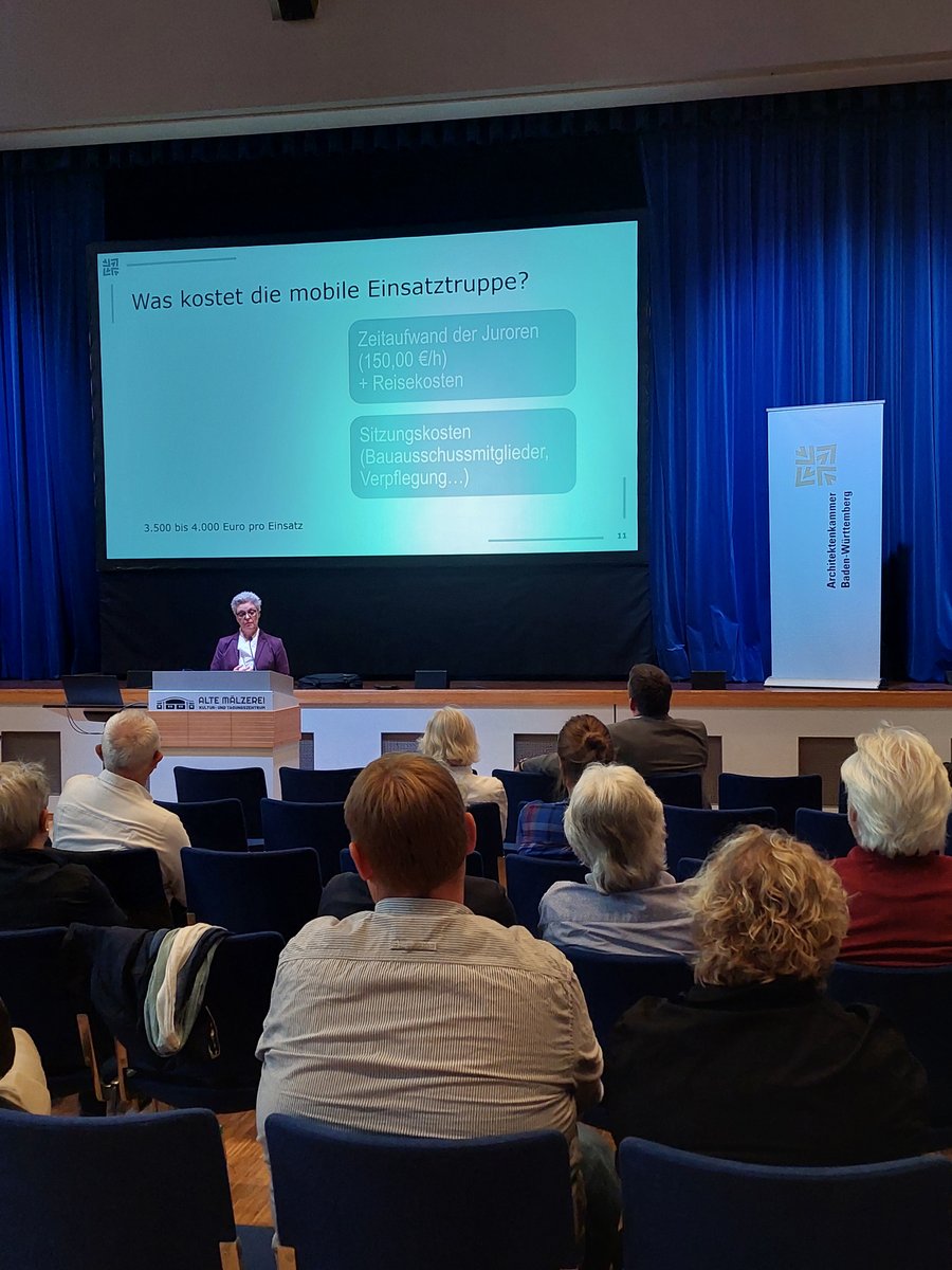 Um insbesondere kleine Kommunen mit schwach besetzten Bauämtern bei den aktuellen Herausforderungen zu unterstützen, bietet die Architektenkammer neben dem Mobilen Gestaltungsbeirat seit 2023 das Instrument des Ortsentwicklungsbeirats an. Darüber informierte Carmen Mundorff, AKBW-Geschäftsführerin Architektur und Baukultur. Als Lotsen motivieren die gelisteten Kolleginnen und Kollegen die Kommunen, Potenziale der Orte zu entdecken und über eine umfassende nachhaltige und strukturelle Verbesserung mit zeitgemäßem Wohnangebot und Nutzung des Gebäudebestands nachzudenken.