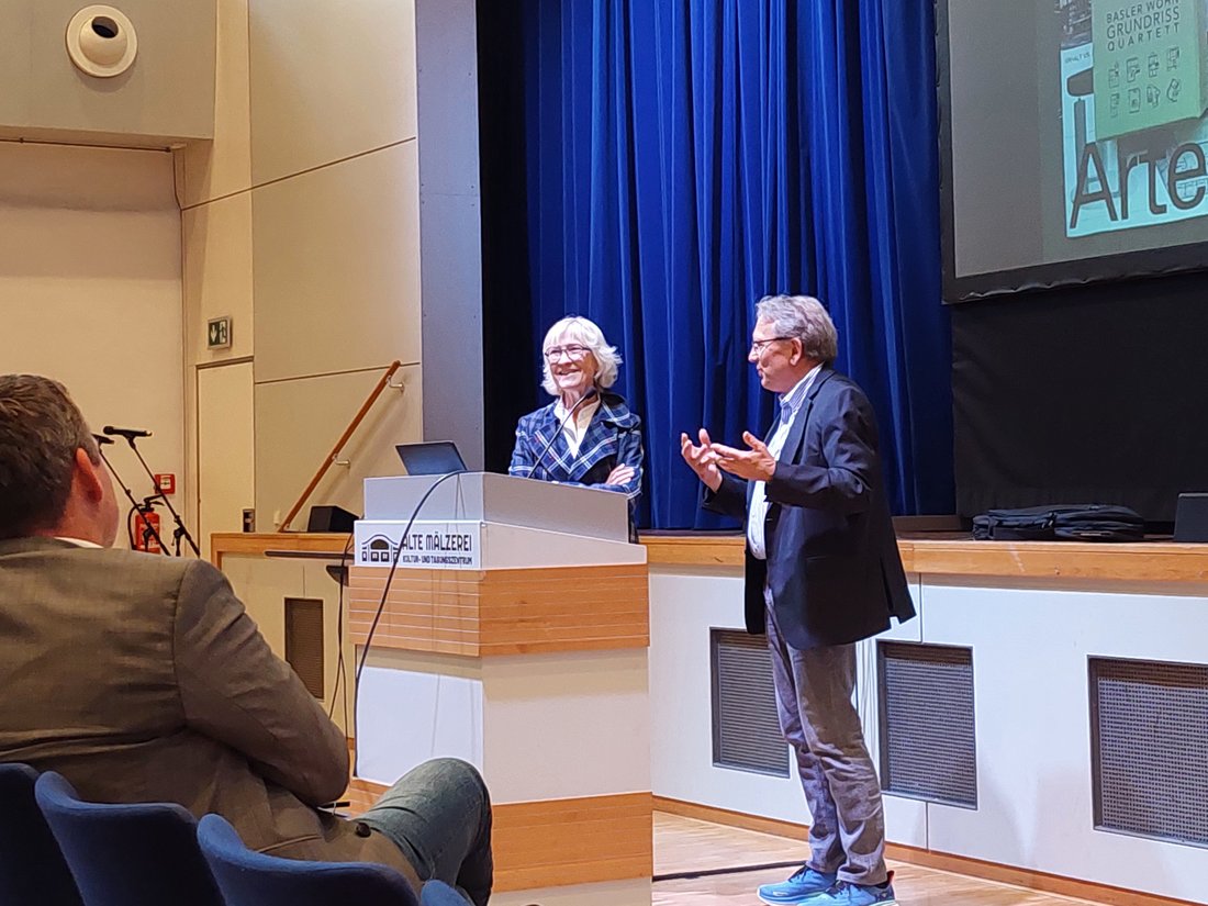 Prof. Susanne Dürr beleuchtete in ihrem Vortrag unterschiedliche Wohnoptionen. Beginnend bei der Dammerstock-Siedlung in Karlsruhe zeigte sie anhand vieler Beispiele bis zur Gegenwart Varianten es gemeinschaftsorientierten, produktiven und adaptiven Wohnens auf.