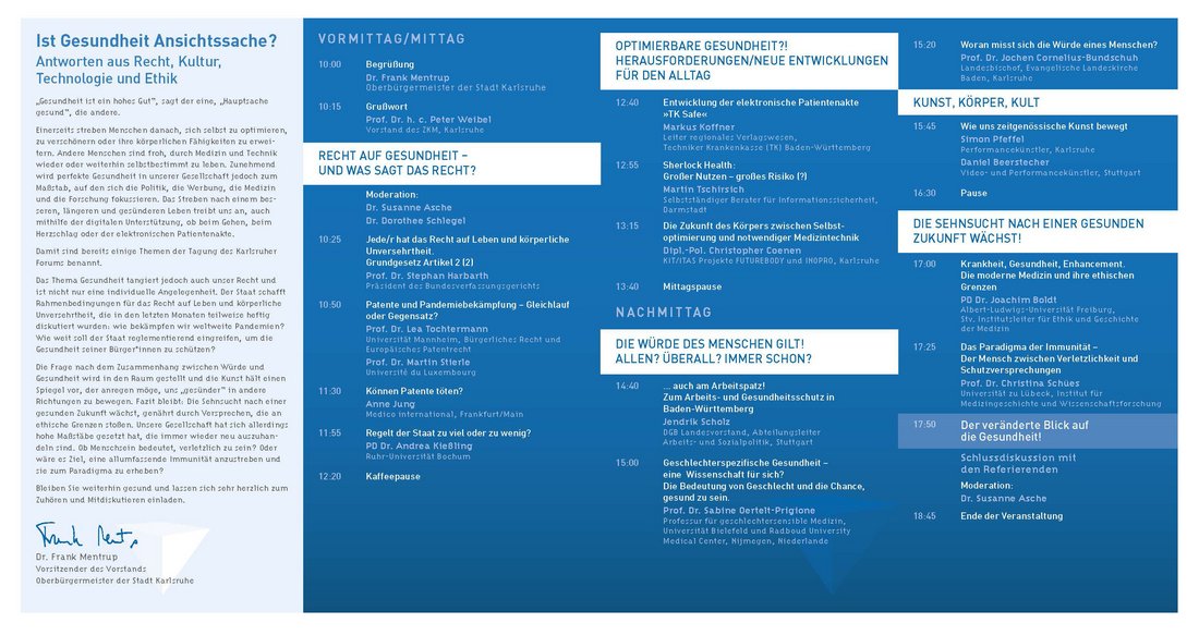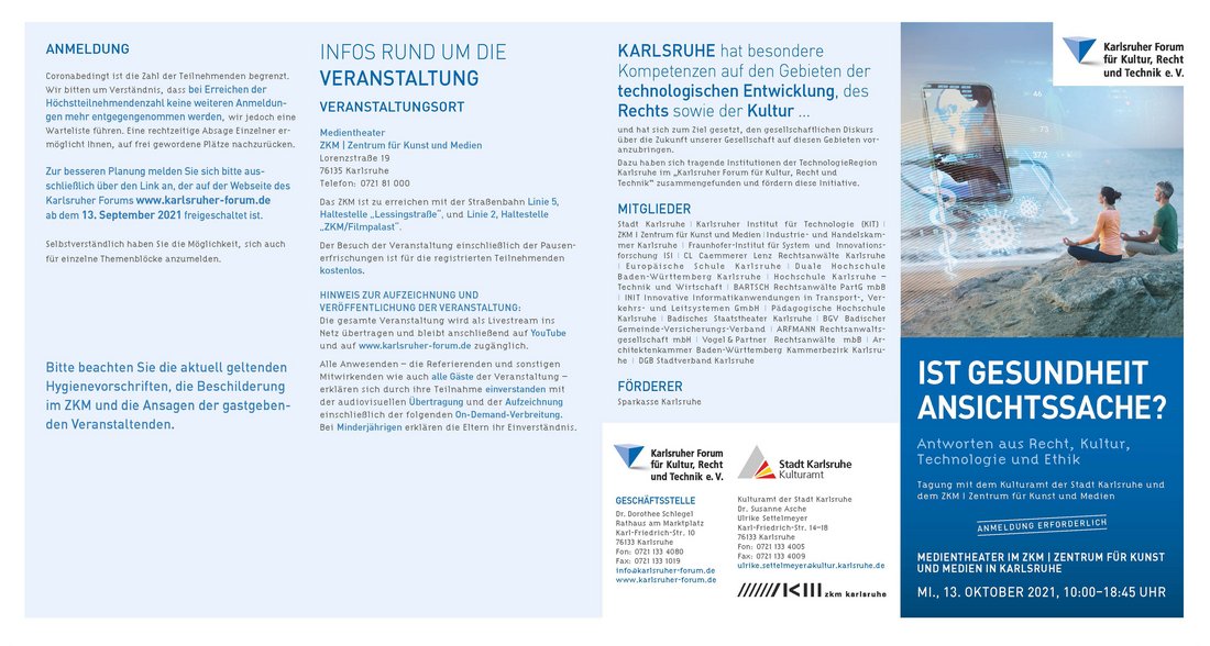 Antworten aus Recht, Kultur, Technologie und Ethik Tagung des Karlsruher Forums in Kooperation mit dem ZKM und dem Kulturamt Karlsruhe „Gesundheit ist ein hohes Gut“, sagt der eine und „Hauptsache gesund“, die andere. Gesundheit ist sowohl ein ganz persönlicher als auch ein gesamtgesellschaftlicher Wert, den unsere Welt in den letzten Jahren neu und intensiv in den Blick genommen hat. Am 13.10.2021 beleuchtet das 23. Symposium des Karlsruher Forums im ZKM das Thema Gesundheit aus überaus unterschiedlichen Perspektiven. Eröffnet wird die Tagung um 10 Uhr durch Oberbürgermeister Dr. Frank Mentrup und den Vorstand des ZKM Prof. Dr. Peter Weibel. Mit dem Grundgesetzartikel 2, dem Recht auf Leben und körperliche Gesundheit setzt Prof. Dr. Stephan Harbarth, Präsident des Bundesverfassungsgerichts den ersten Impuls. Ob Patente und Pandemiebekämpfung Gegensätze oder einen Gleichlauf bilden, erläutern Prof. Dr. Lea Tochtermann, Universität Mannheim und Prof. Dr. Martin Stierle, Université du Luxembourg. Anne Jung von Medico International bringt mit ihrem Vortrag „Können Patente töten?“ zu bedenkende Aspekte ein. Die in den letzten Monaten häufig diskutierte Frage, ob der Staat nun tatsächlich zu viel oder zu wenig regelt, führt PD Dr. Andrea Kießling, Ruhr-Universität Bochum aus. Der Wunsch, sich selbst zu optimieren, sich zu verschönern und seine körperlichen Fähigkeiten zu erweitern oder zu erhalten, geht auch einher mit technischen und digitalen Entwicklungen, wie der elektronischen Patientenakte, die vom Leiter des regionalen Vertragswesens der TK Markus Koffner vorgestellt wird. „Sherlock Health“ Martin Tschirsich referiert über Nutzen und Risiken sich digitalisierender Gesundheit. Die Medizintechnik, seit Jahrhunderten notwendend, so Dipl.-Pol. Christopher Coenen vom KIT, trägt jedoch auch zur Selbstoptimierung des Körpers bei. Wie Gesundheit und Würde des Menschen zusammenhängen, erläutern Jendrik Scholz, DGB zum Thema Arbeits- und Gesundheitsschutz und Prof. Dr. Sabine Oertelt-Prigione, die den ersten Lehrstuhl in Deutschland für geschlechtersensible Medizin an der Universität Bielefeld innehat. Prof. Dr. Jochen Cornelius-Bundschuh, Evangelischer Landesbischof findet Antworten darauf, woran sich die Würde eines Menschen misst. In zwei kurzen Performances zeigen Simon Pfeffel und Daniel Beerstecher, wie sich zeitgenössische Kunst mit Gesundheit auseinandersetzt. Einerseits wächst nun die Sehnsucht nach einer gesunden Zukunft. Allerdings werden der modernen Medizin auch ethische Grenzen gesetzt, so PD Dr. Joachim Boldt, Albert-Ludwigs-Universität Freiburg. Und was das „Paradigma der Immunität“ bedeutet, dazu referiert Prof. Dr. Christina Schües, Universität zu Lübeck. Ob sich der Blick auf die Gesundheit verändert hat oder verändert wird, wird in der abschließenden Podiumsdiskussion mit den Referierenden, moderiert von Dr. Susanne Asche, beleuchtet. Coronabedingt ist die Zahl der Gäste auch in diesem Jahr sehr begrenzt. Daher erfolgt die ausschließliche Anmeldung über den Link auf der Webseite www.karlsruher-forum.de, die ab 16. September 2021 freigeschaltet sein wird. Dort ist auch das Gesamtprogramm zu finden. Die Veranstaltung wird zudem als Livestream ins Netz übertragen, um vielen Interessierten auf diese Weise die Teilnahme zu ermöglichen. Die Teilnahme an der Tagung ist kostenlos.