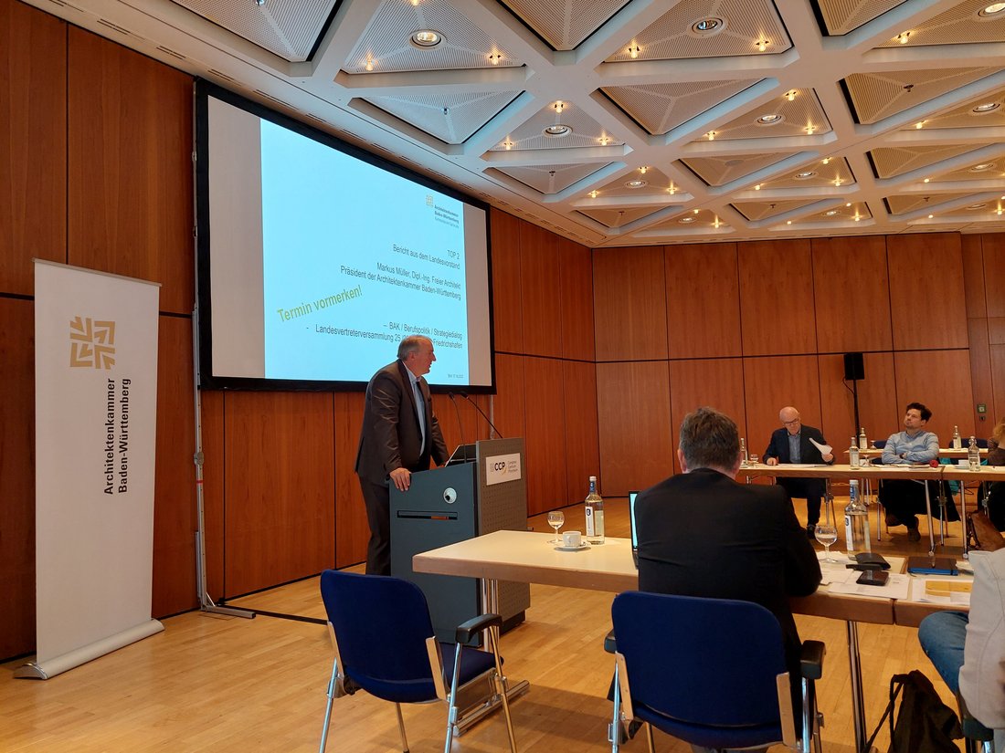 Zusammen mit dem Präsidenten Markus Müller wurde über berufspolitische Themen, die Holzbauinitiative, den Strategiedialog, dessen Geschäftsstelle für die nächsten sieben Jahre im Haus der Architekten in Stuttgart zusammen mit der Gesellschaft für nachhaltiges Bauen (dgnb) und dem Verband der Bauwirtschaft geführt wird, den Haushalt und die Mitgliederzahlen informiert und diskutiert.