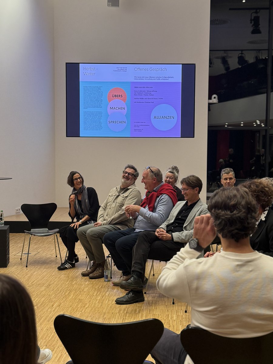 Wie entsteht Vertrauen zwischen Stadtgesellschaft, Politik und Verwaltung – und wie lässt es sich in konkrete Handlungskraft übersetzen? Im Rahmen des Macher:innengesprächs „Allianzen“ am 22. Oktober 2025 stellten drei engagierte Akteur:innen ihre Arbeit vor, in der Allianzen nicht bloß Schlagwort, sondern gelebte Praxis sind:Ilona Schaal vom Theater Rampe, Irene Armbruster von der Bürgerstiftung Stuttgart und Jan Hambach vom Städtetag Baden-Württemberg gaben Einblick in ihre Arbeit und zeigten, wie lokale Netzwerke, Offenheit im Prozess und kreative Formen der Beteiligung neue Räume für gemeinsames Gestalten öffnen können.