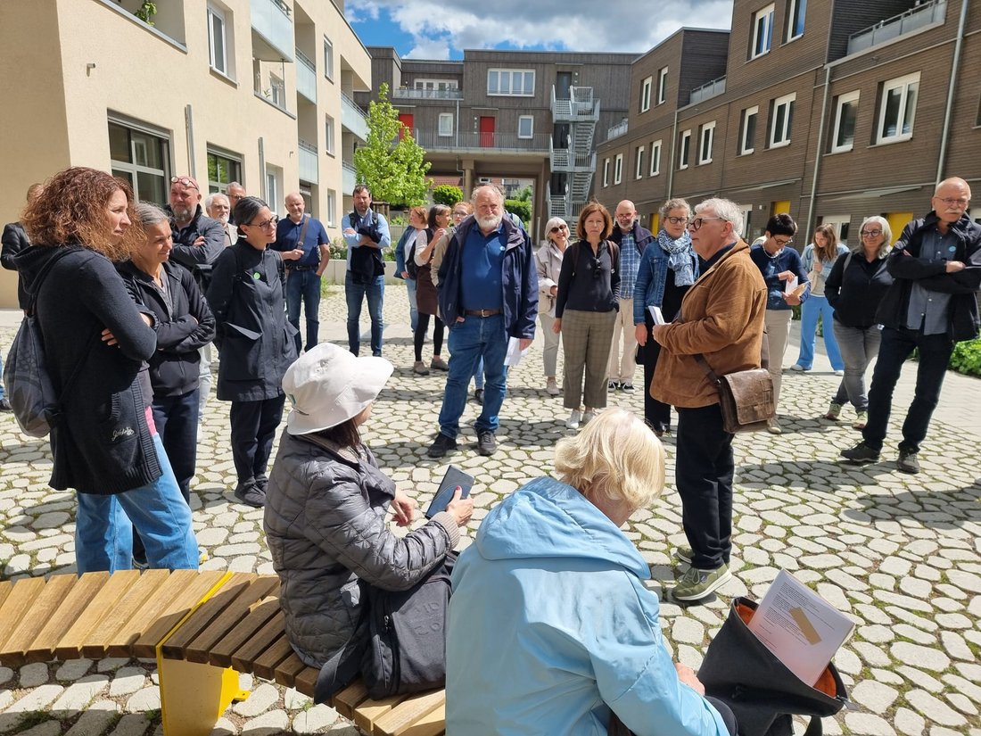 Die Tour begann bei den Fehrle-Gärten, ein IBA -Netzprojekt, wo ein autofreies urbanes Quartier mit 147 Mietwohnungen, Kindertagesstätte und Ärztezentrum auf eine ehemalige Brache einer Gärtnerei entstand. Die Landesbaugenossenschaft e.G. aus Stuttgart, der Baubürgermeister der Stadt Schw. Gmünd, sowie die Architekten erläuterten bei einem Rundgang, Ideen und Bauweisen und aus welchen Gründen das Projekt zum IBA 27 Netzwerkprojekt erhoben wurde.