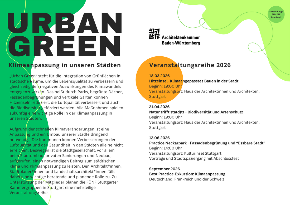 „Urban Green“ steht für die Integration von Grünflächen in städtische Räume, um die Lebensqualität zu verbessern und gleichzeitig den negativen Auswirkungen des Klimawandels entgegenzuwirken. Das heißt durch Parks, begrünte Dächer, Fassadenbegrünungen und vertikale Gärten können Hitzeinseln reduziert, die Luftqualität verbessert und auch die Biodiversität gefördert werden. Alle Maßnahmen spielen zukünftig eine wichtige Rolle in der Klimaanpassung in unseren Städten.Aufgrund der schnellen Klimaveränderungen ist eine Anpassung und ein Umbau unserer Städte dringend notwendig. Die Kommunen können Verbesserungen der Luftqualität und der Gesundheit in den Städten alleine nicht erreichen. Deswegen ist die Stadtgesellschaft, vor allem beim Stadtumbau, privaten Sanierungen und Neubau, aufgerufen, einen notwendigen Beitrag zum städtischen Klima und Klimaanpassung zu leisten. Den Architekt*innen, Stadtplaner*innen und Landschaftsarchitekt*innen fällt dabei eine wichtige beratende und planende Rolle zu. Zu Unterstützung der Mitglieder planen die FÜNF Stuttgarter Kammergruppen in Stuttgart eine mehrteilige Veranstaltungsreihe 2026.