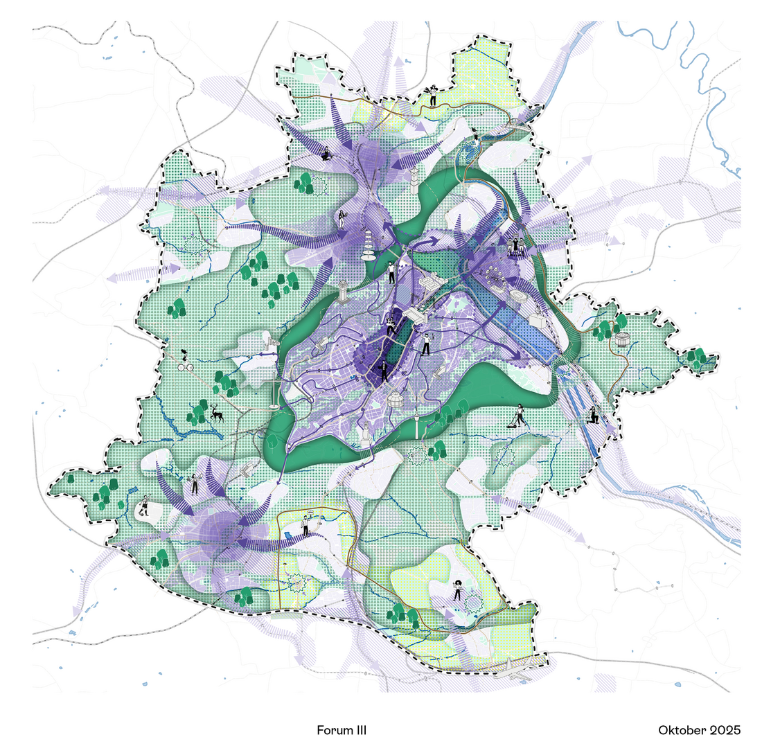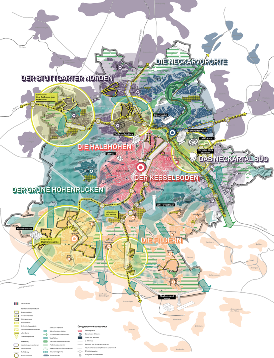 Das Team Urbanista, Hamburg mit Antje Stokmann sieht einen Schwerpunkt der künftigen Stadtentwicklung im B10-Korridor vom Neckartal über den Pragsattel bis Zuffenhausen. Hier soll transformiert werden, ohne die starke industrielle Prägung aufzugeben. Einen weiteren Schwerpunkt bildet die Filderebene. Sie wird als „unterbelichtetes Powerhouse“ bezeichnet und soll neue Dynamik im Zusammenspiel von Flughafen/Messe mit den großen Universitäts- und Forschungsstandorten in Vaihingen und Hohenheim entwickeln. Für den Stuttgarter Kessel werden unter dem Stichwort „mehr Südeuropa wagen“ Wege aufgezeigt, wie eine hochverdichtete Stadt mit dem Klimawandel zurechtkommen kann. Im Neckarbecken und den Großsiedlungen auf den Hochplateaus im Norden schließlich wird großes Potential für vielfältiges und entspanntes Wohnen erkannt (Copyright der beiden Pläne: Urbanista).