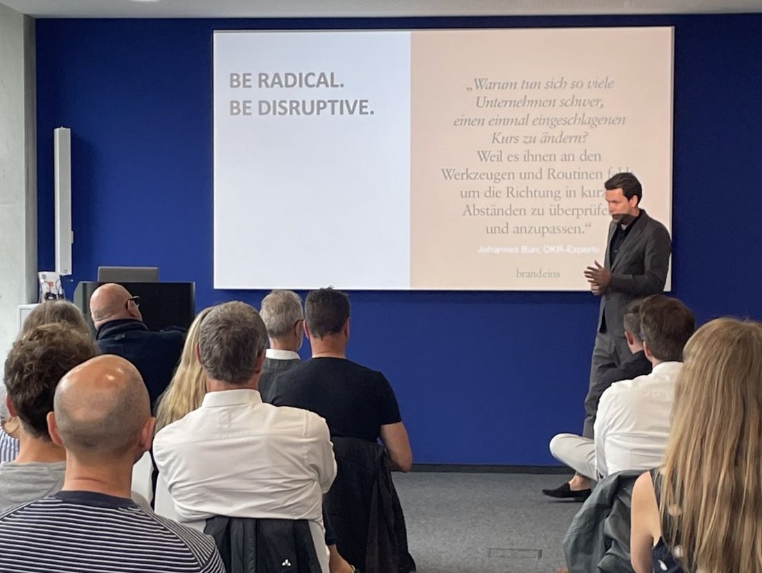 Prof. Dr. Daniel Schallmo betonte, wie wichtig es ist, Werte in einem Unternehmen gemeinsam mit den Mitarbeitenden zu entwickeln. Der Ökonom und Unternehmensberater stellte in seinem Impulsvortrag zum Thema „Strategie und Positionierung“ das Modell der Ambidextrie, der sogenannten beidhändigen Führung vor: „Das heißt, ich muss einerseits das operative Geschäft erledigen, mir aber darüber hinaus Raum schaffen, um in die Zukunft zu schauen und die Entwicklung von Innovationen zu berücksichtigen.“