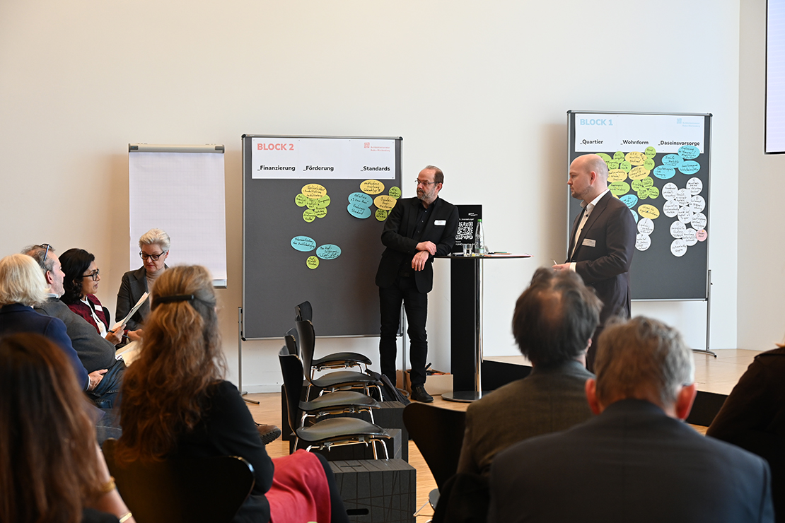 Rund 30 Vertreterinnen und Vertreter des Wohnungsbaus diskutierten neuralgische Punkte: das Fehlen einer Umbaukultur, dichtere Quartiere als Maßstab, verhinderndes Mietrecht, Objekt- statt Pro-Kopfförderung oder Harmonisierung der Förderungen auf Bundes- und Länderebene. Erste Maßnahme einer neuen Regierung: gesetzliche Voraussetzungen schaffen für den Gebäudetyp-e.