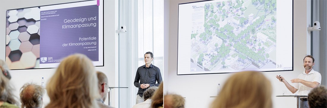 Dr. René Burghardt von der Uni Kassel, Experte für Geodesign und Klimaanpassung, erachtet das Erkennen lokaler Potenziale und Defizite für wichtig. Denn jeder Raum, jeder Ort sei individuell und müsse dem Klima entsprechend angepasst werden. Dafür seien Daten wichtig, um den Raum besser analysieren und interpretieren zu können und damit beispielsweise Hotspots, Coolspots oder Frischluftschneisen zu erkennen. Das Thema Klimaanpassung stehe meist viel zu spät auf der Agenda – klimatische Steckbriefe sollten schon im städtebaulichen Wettbewerb berücksichtigt werden. „Aspekte des Klimas und der Klimaanpassung eröffnen das Potenzial um Raum, Zeit, Funktion, Nutzung zukunftsgerecht miteinander zu verknüpfen“, so Burghardt. „Berücksichtigung des Klimas ist nicht das fünfte Rad am Wagen. Wir benehmen uns wie kleine verwöhnte Kinder, die sagen: ‚Klimaschutz, muss das jetzt auch noch sein!‘“