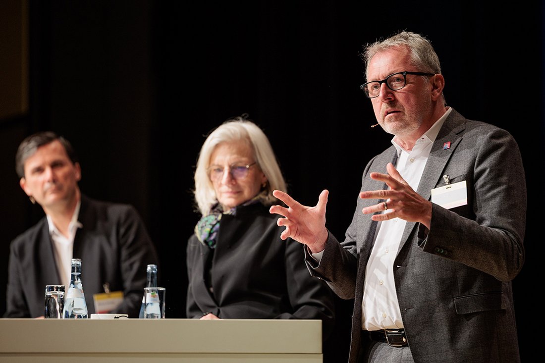 Der Züricher Architekt und Neurologe Markus Schaefer nahm die Gäste mit auf eine Zeitreise mit der zentralen Frage: Wie würden wir leben, wenn wir die Gestaltungsaufgabe Nachhaltigkeit ernst nähmen?“ Aktive Stadtentwicklung bedeute die Rückkehr der Industrie in die Stadt, ähnlich wie etwa im Mittelalter. Es muss um Kreislaufwirtschaft und Materialschonung gehen, um eine inklusive, produktive Gesellschaft. „Wir sind an einem Punkt angelangt, an dem wir die Dinge wieder neu zusammendenken müssen.“