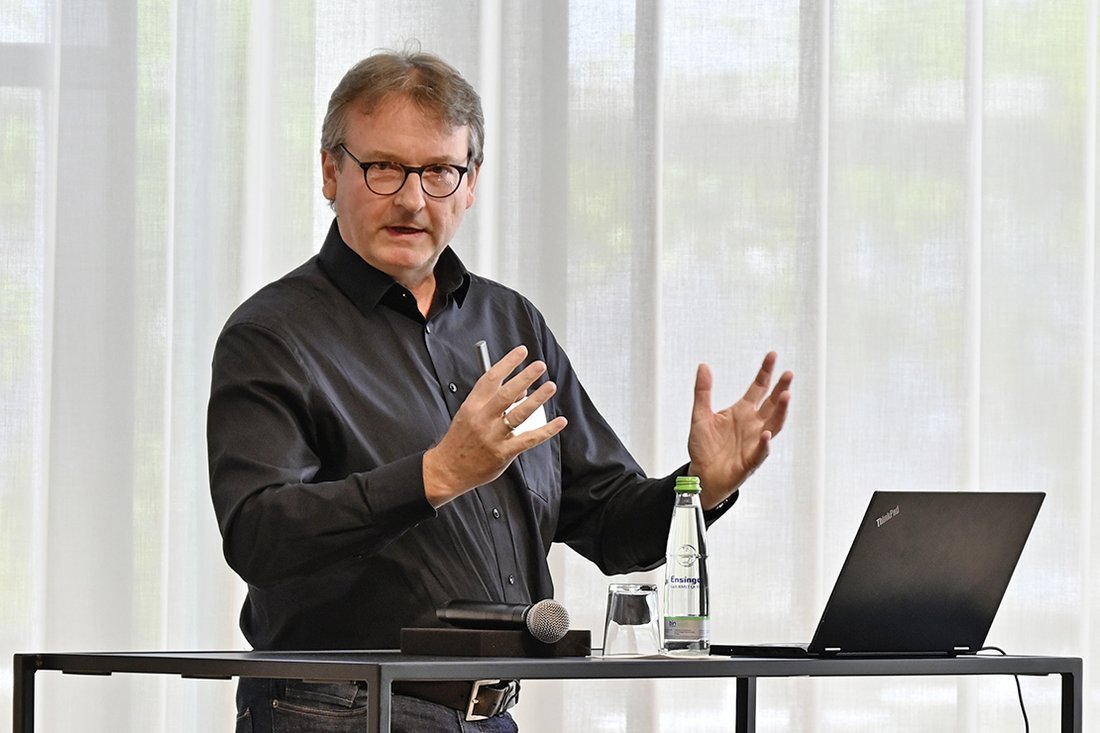 Stadtplaner Albrecht Reuß, begleitendes Vorstandsmitglied im Kompetenzteam Landesentwicklung, das die Veranstaltung federführend konzipiert hatte, freute sich über rund 150 Gäste im Haus der Architektinnen und Architekten sowie 100 Teilnehmende online: zur Hälfte Stadtplanerinnen und Stadtplaner, etwa ein Drittel Landschaftsarchitektinnen und Landschaftsarchitekten, der Rest aus Architektur, Wirtschaft, Wissenschaft … „Die Planung und die Planungsaufgaben werden immer komplexer. Wir können sie nicht mehr nur aus der jeweiligen Disziplin lösen, wir brauchen Verbündete“, konstatierte Hannes Bäuerle, Vertreter der Landschaftsarchitektur im AKBW-Landesvorstand. „Nur im Kollektiv schaffen wir das Zusammenspiel aller Beteiligten und nur so gelingt uns die Umsetzung der planerischen Aufgaben.“