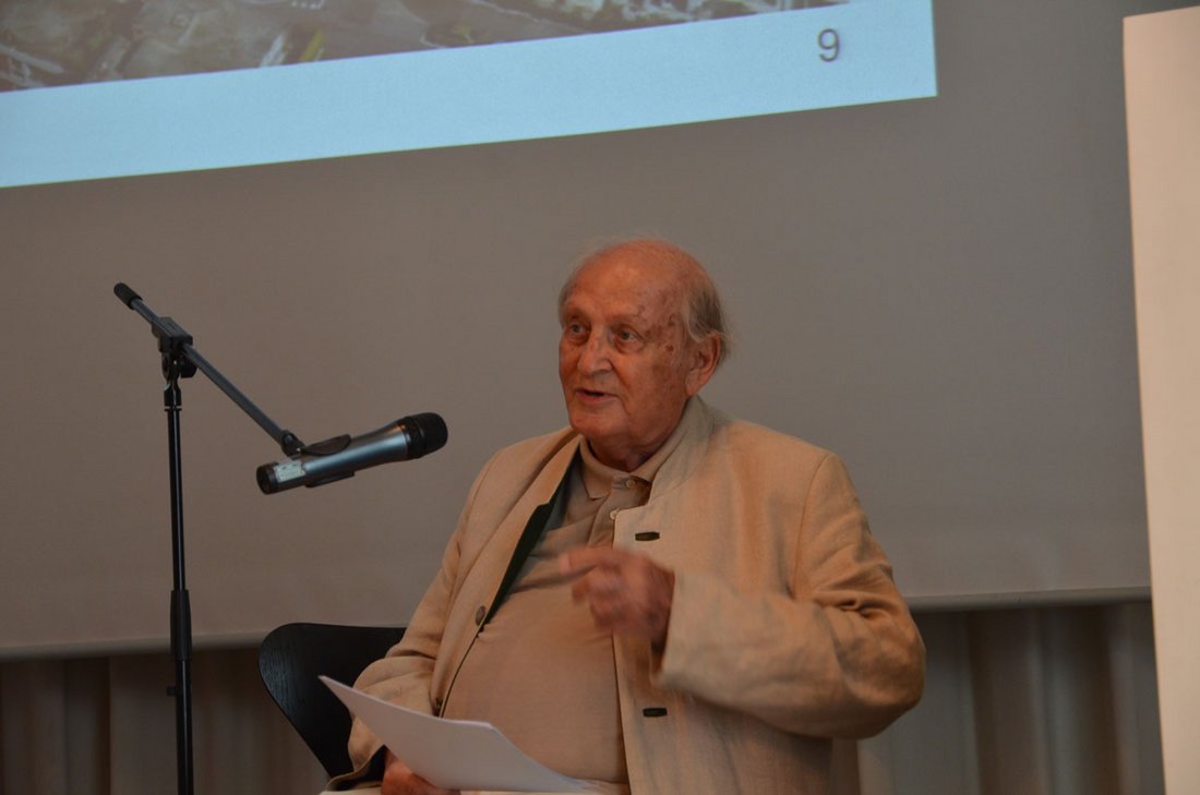 Erster Referent des Nachmittags war Hans Zwimpfer, Architekt BSA/SIA aus Basel, der allerdings streng genommen kein baugewerblich tätiger Architekt ist, da in der Schweiz die Trennung in „freie“ und „baugewerblich tätige“ Architekten gar nicht existiert. Eindrucksvoll belegte der über achtzigjährige Zwimpfer, wie er frei von solch berufsrechtlichen Beschränkungen im In- und Ausland hervorragende Architektur schuf. 1957 legte der Wettbewerbsgewinn für den Neubau der Hochschule St. Gallen den Grundstein für die weitere Entwicklung des gemeinsam mit dem Bildhauer Walter Förderer und dem Architekten Rolf Otte gegründeten Büros.