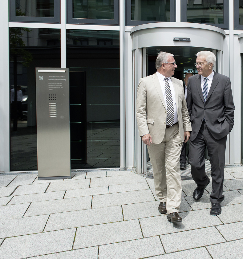 Riehles Wunsch zur schnellen Einführung der "Partnerschaft mbBH" für Architekten wich Kretschmann aus: er habe „als MP" bald gelernt, nicht zu schnell etwas zu sagen, ohne vorher seinen Fachminister zu befragen. Doch er bedankte sich knitz für das Lob, das Riehle „an der einen oder anderen Stelle" für ihn übrig gehabt habe. Man müsse sich in der Politik natürlich von Lob freimachen, „doch wenn es ab und zu kommt, macht das ja auch nix." Kretschmann enttäuschte die gespannt lauschenden Zuhörer nicht und erzielte trotz ernster Themen manchen Lacher. „Bauen Sie schön weiter!" war seine lockere Schlussformel, bevor er sich noch die Zeit für Fragen und Gespräche im kleinen Kreis nahm.